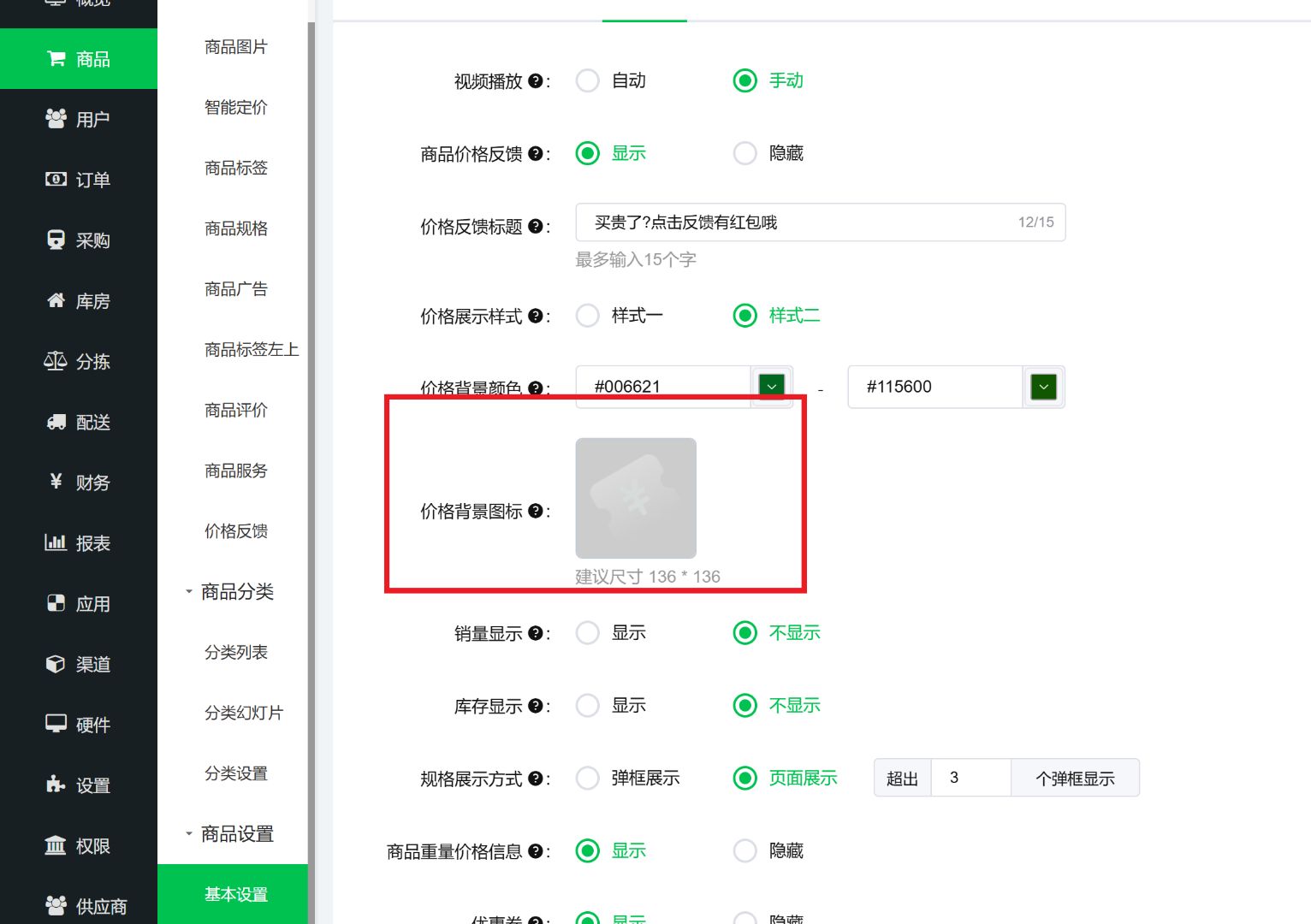 新增详情价格背景图标功能,可在价格展示区域添加背景图标,提升视觉效果;【解读】:可在价格旁边添加背景图标(如"优惠""热销""限时"),突出商品价格优势,吸引用户注意力,提升商品转化率。