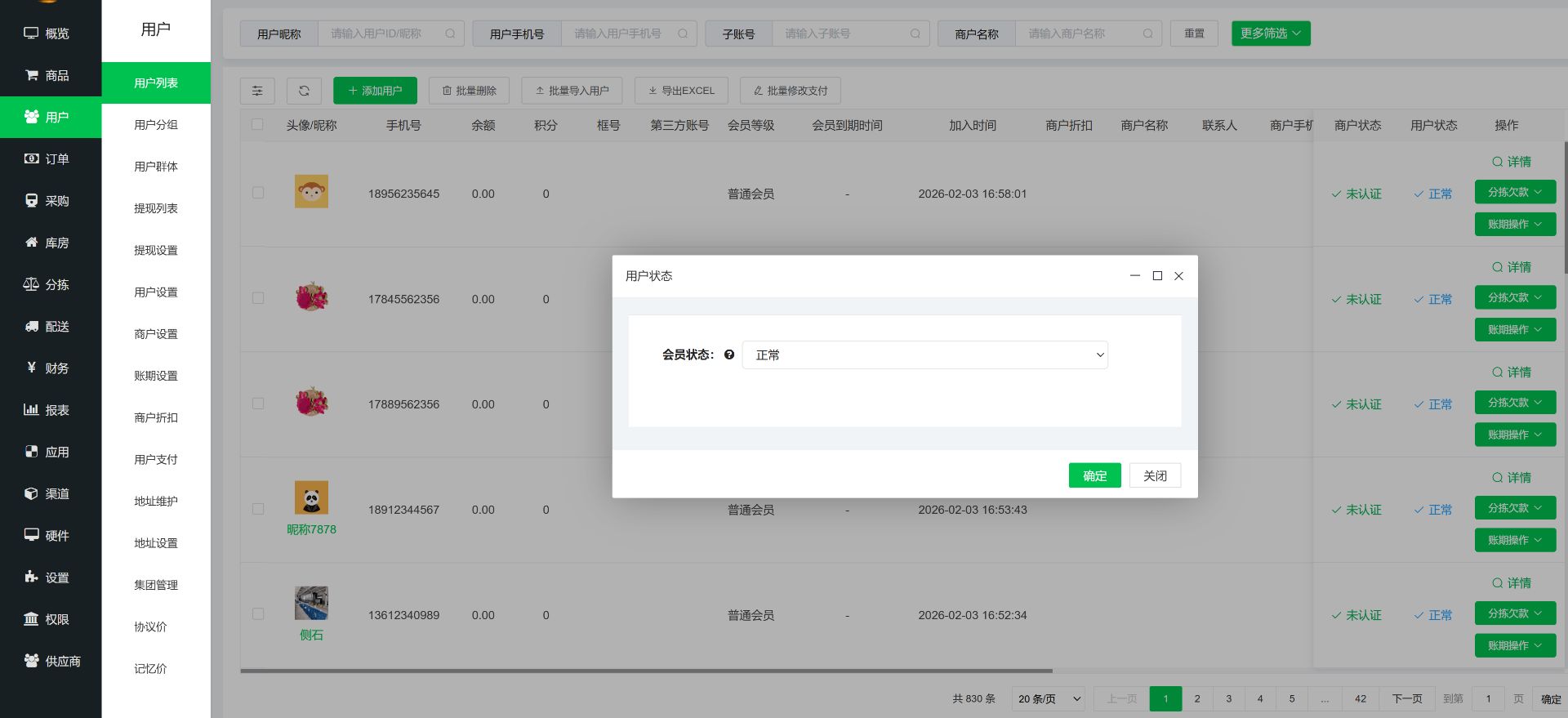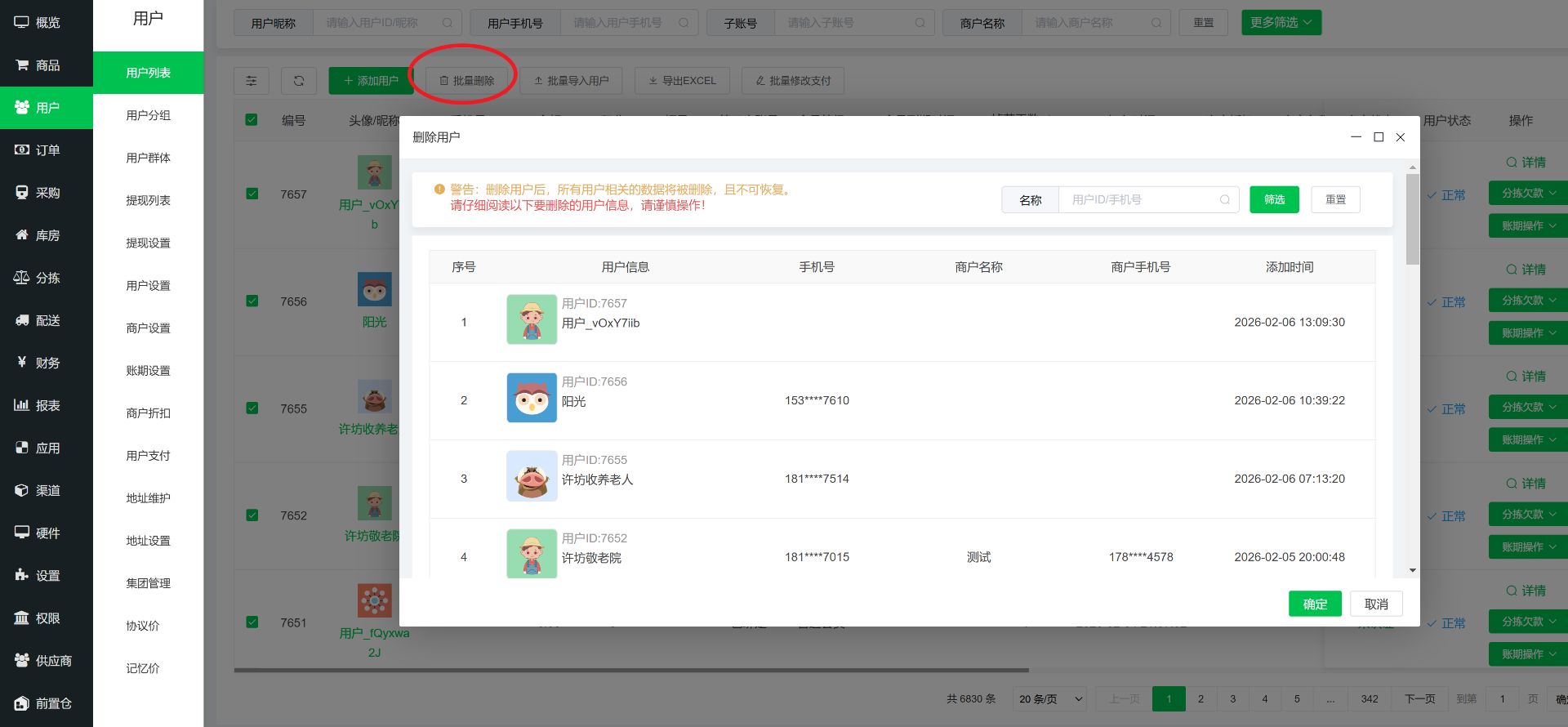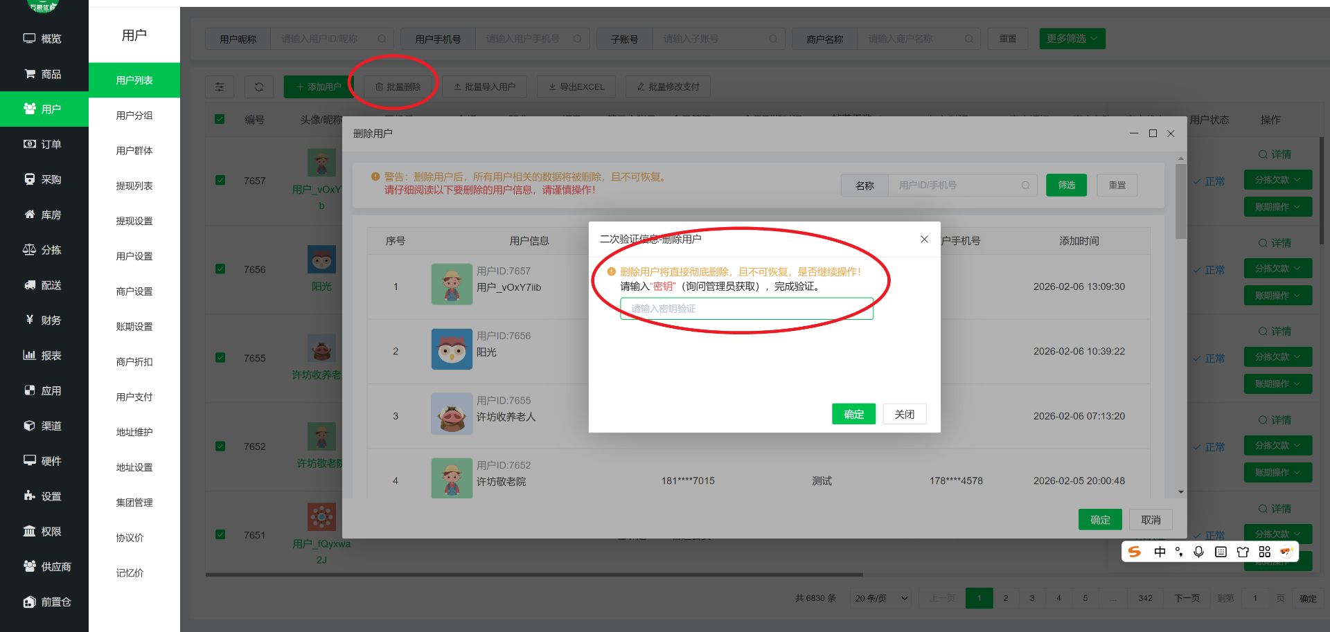 用户-用户列表中,增加批量删除用户功能;因用户信息敏感,每次批量删除需管理员提供一次性删除秘钥,保障信息安全;【解读】:可批量删除无效用户(如过期客户、测试用户),节省管理员时间;同时需要秘钥验证,防止误删、恶意删除用户信息,保障用户数据安全。