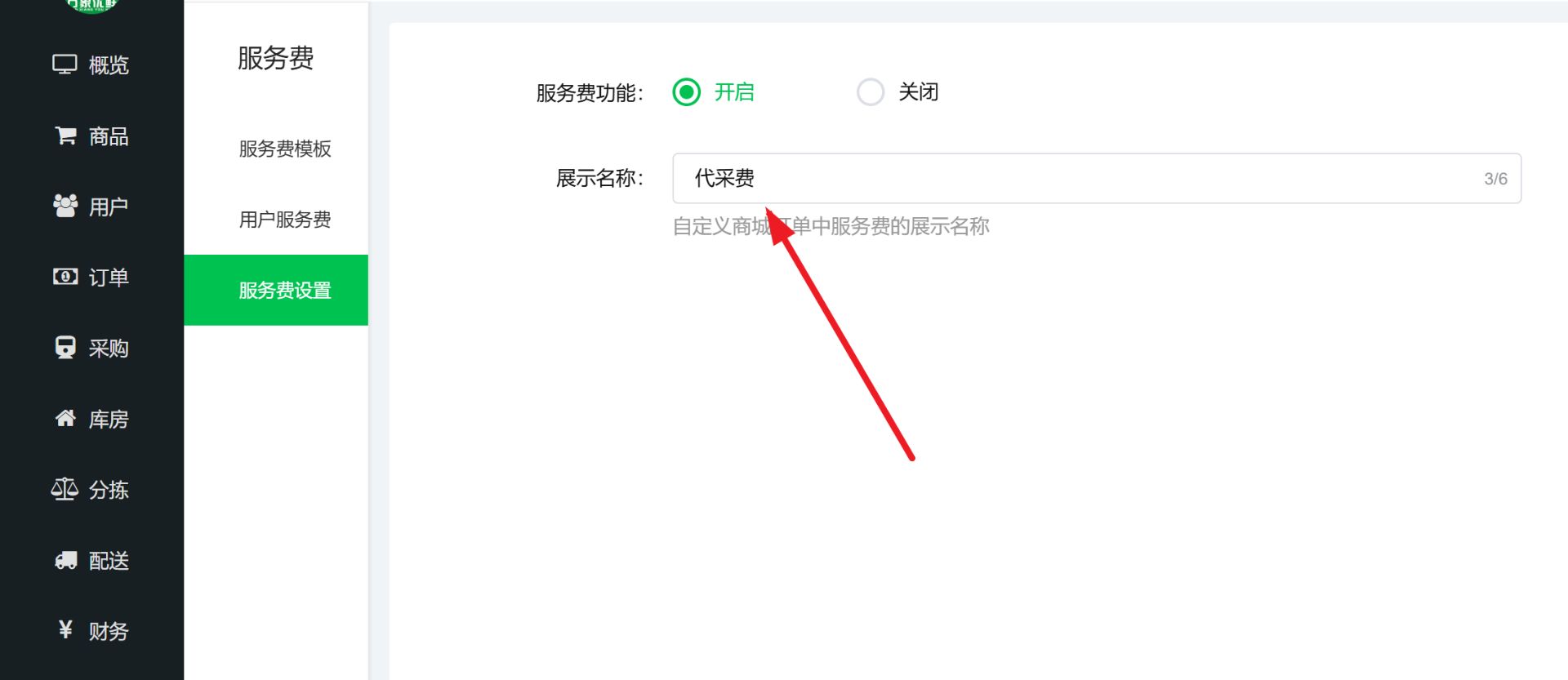 支持服务费功能自定义全局展示名字,可根据企业需求修改显示名称;【解读】:可将"服务费"改成符合企业业务习惯的名称(如"代采服务费""集采费"代买费,"跑腿费"),让系统显示与需求一致,让客户更好理解。