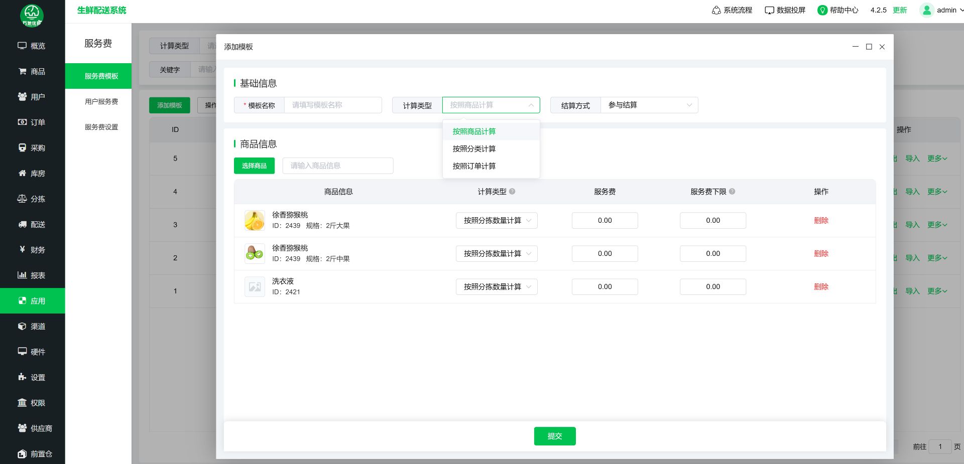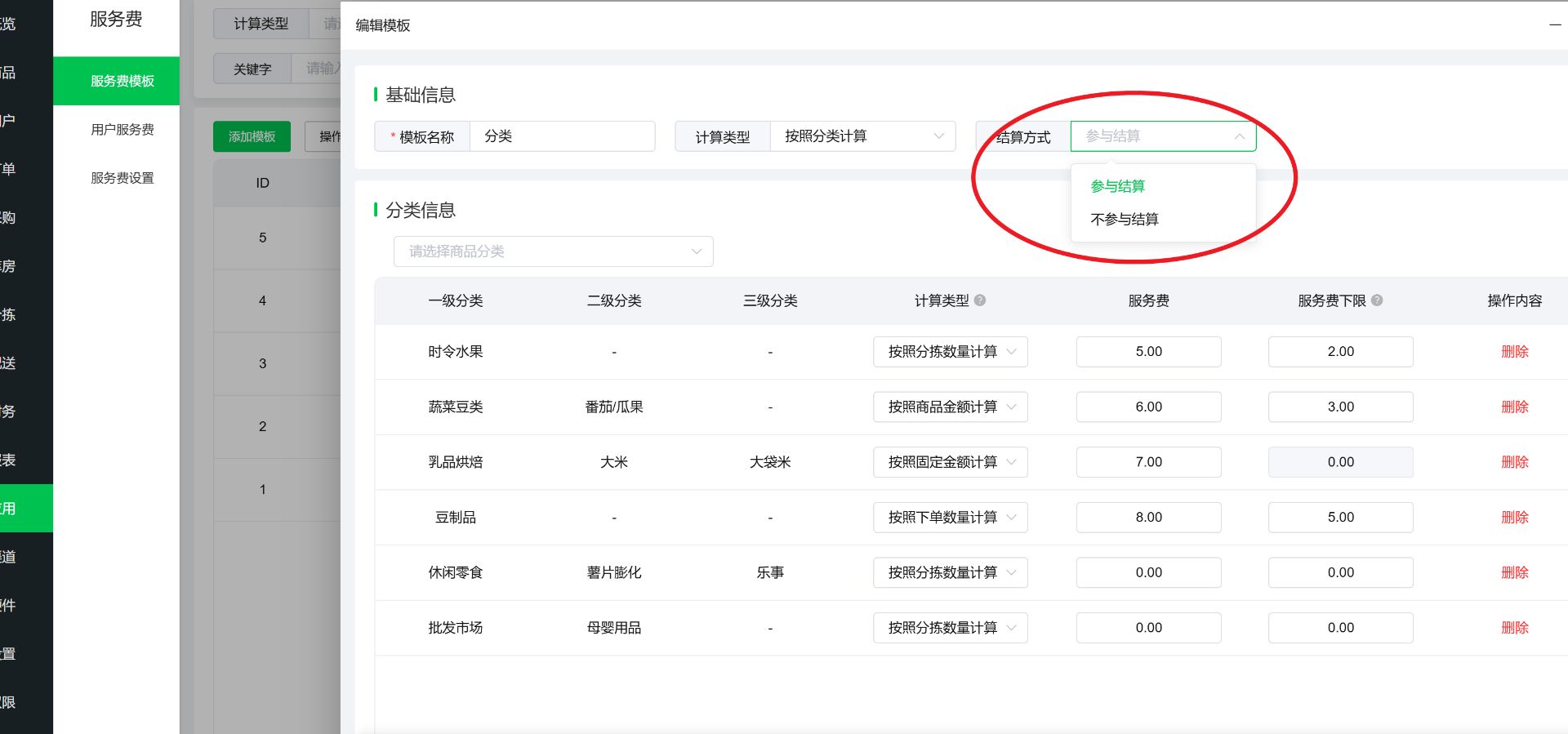 添加服务费模版时,支持按分拣数量计算、商品金额计算、固定金额计算、下单金额计算四种方式,可按需选择;【解读】:根据实际业务场景选择服务费核算方式,比如易分拣的商品按分拣数量算,高价值商品按商品金额算,灵活适配各类生鲜商品的收费需求。