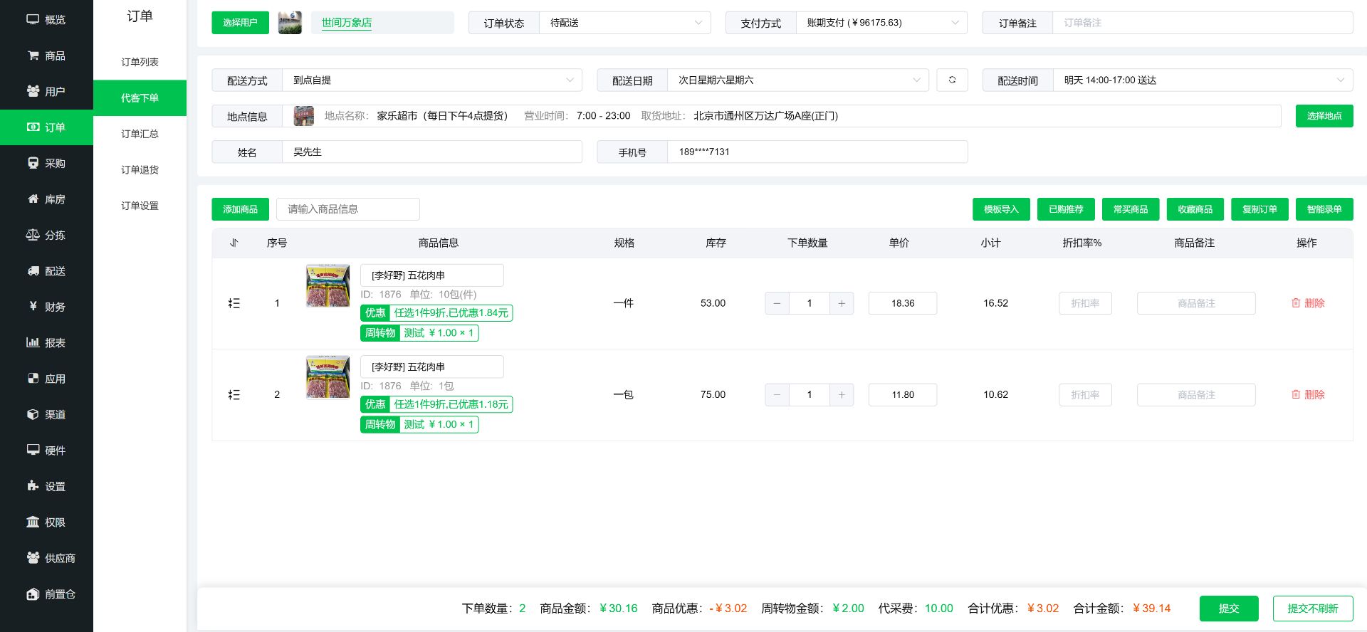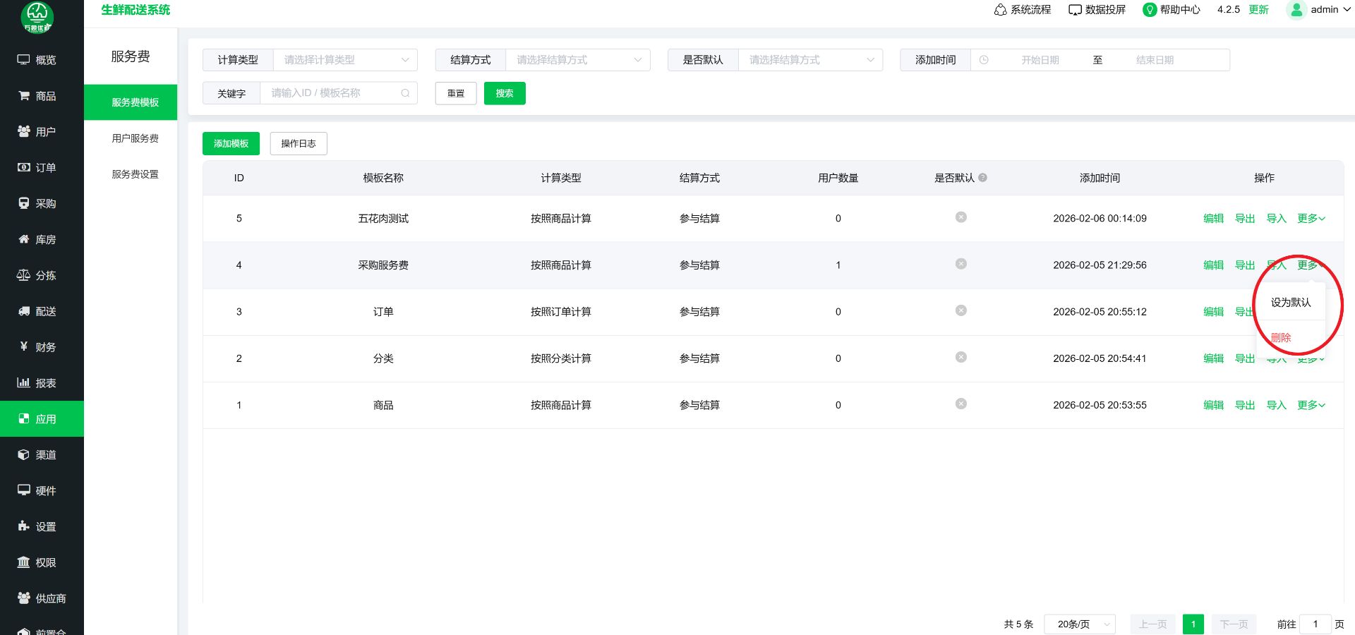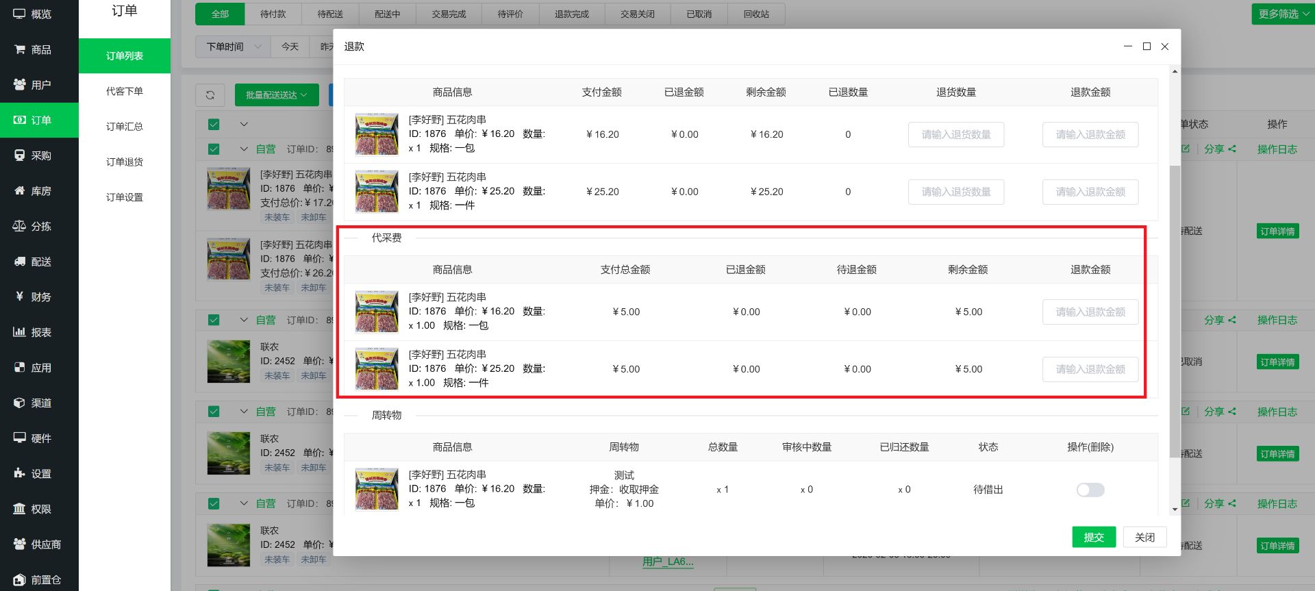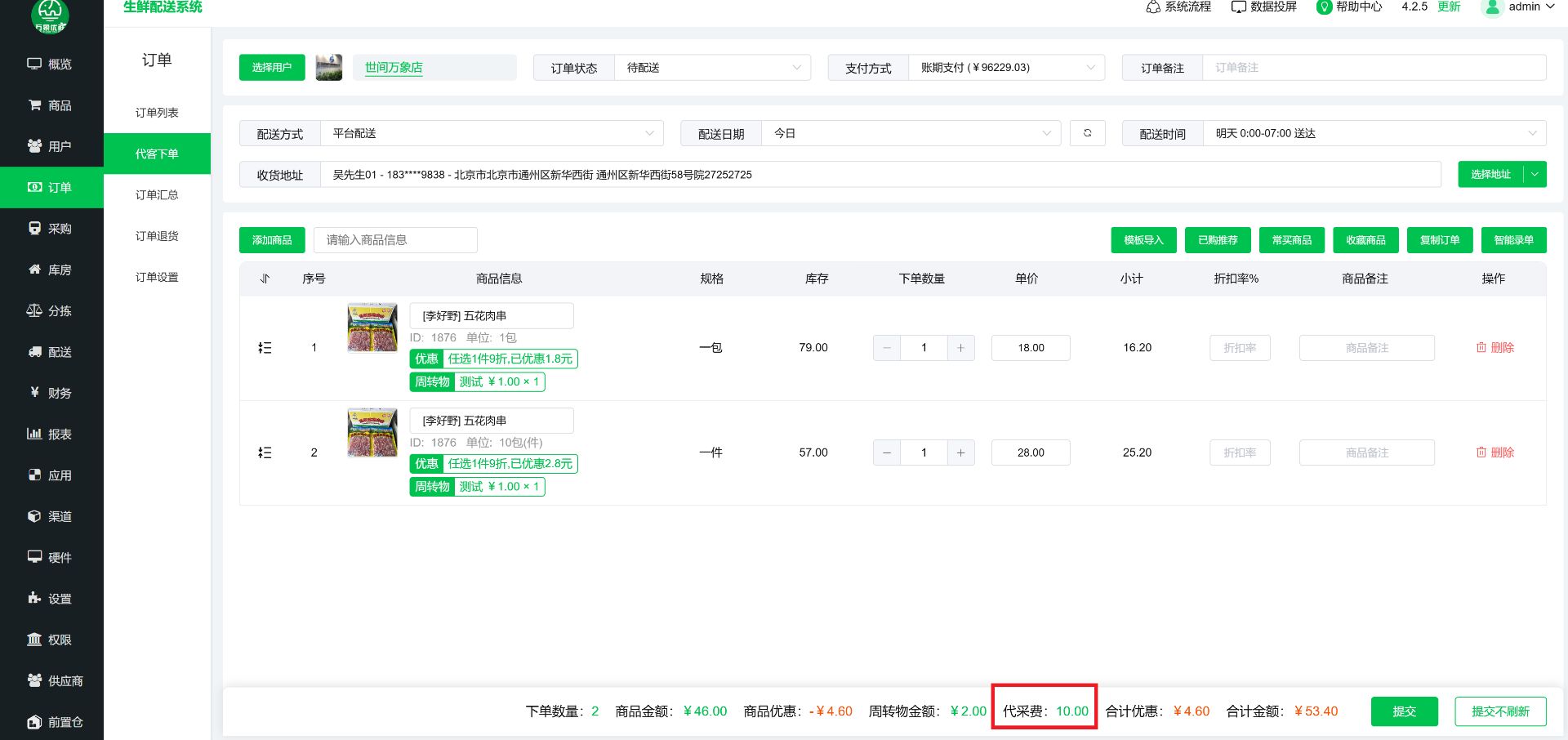 后台可以灵活设置不同客户、不同商品的代采费模版,适配差异化代采业务场景;【解读】:生鲜配送中,不同客户的代采需求(如代采高端生鲜、普通蔬菜)、不同商品的代采难度不同,可针对性设置代采费模版,让代采费核算更合理、灵活。