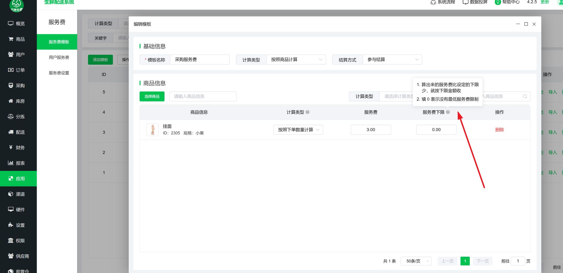 添加服务费时支持设置下限服务费,当计算出的服务费不足下限金额时,默认收取最低服务费;【解读】:避免因订单金额小、分拣数量少(如只订1斤蔬菜),导致核算出的服务费过低,不足以覆盖代采服务成本,设置下限后,系统自动按最低标准收取,保障平台收益。