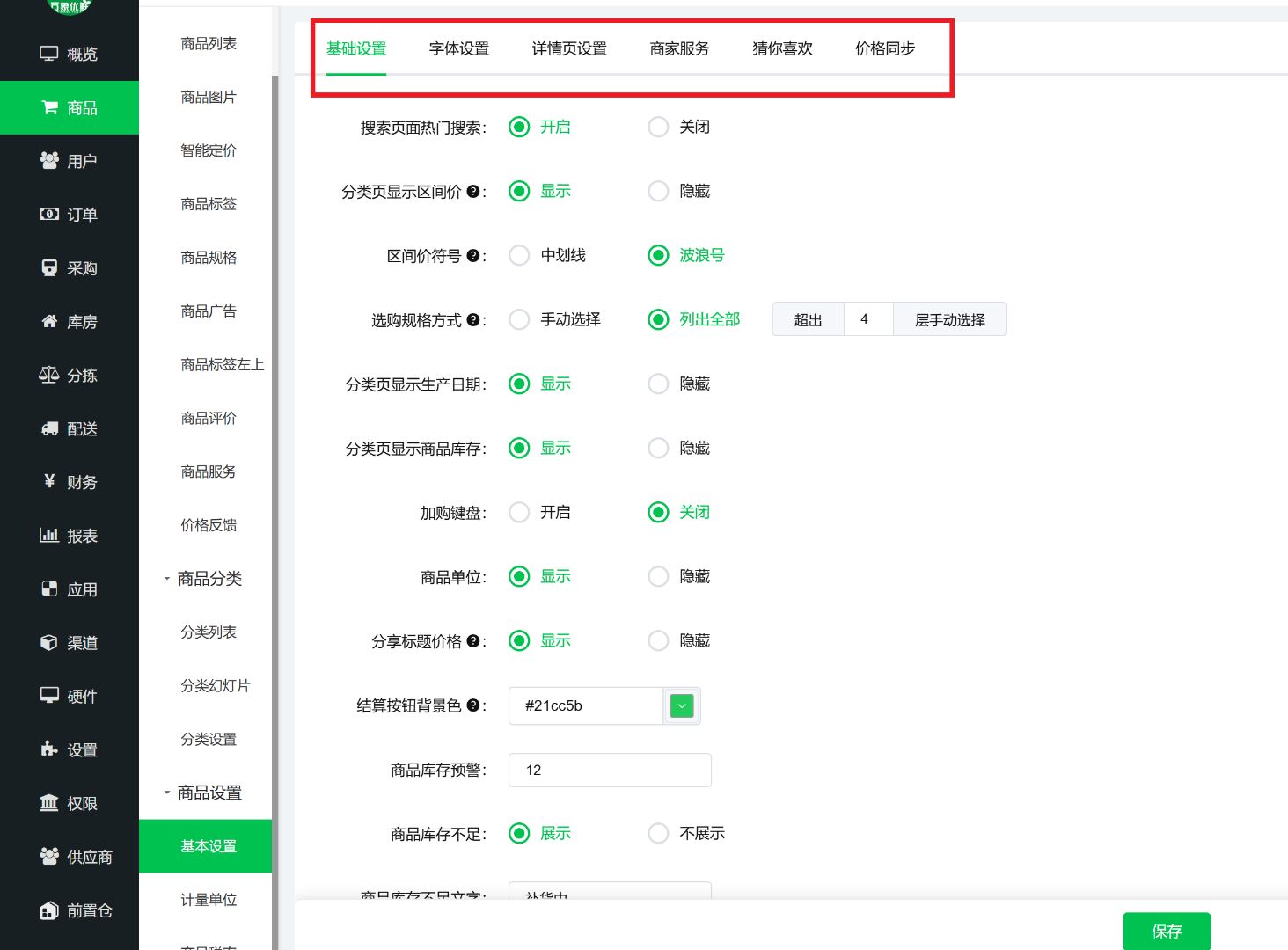 重构后台商品设置页面,优化商品管理相关操作流程,提升操作便捷性;【解读】:重构布局,优化分类方便快速的找到自己需要设置的内容。