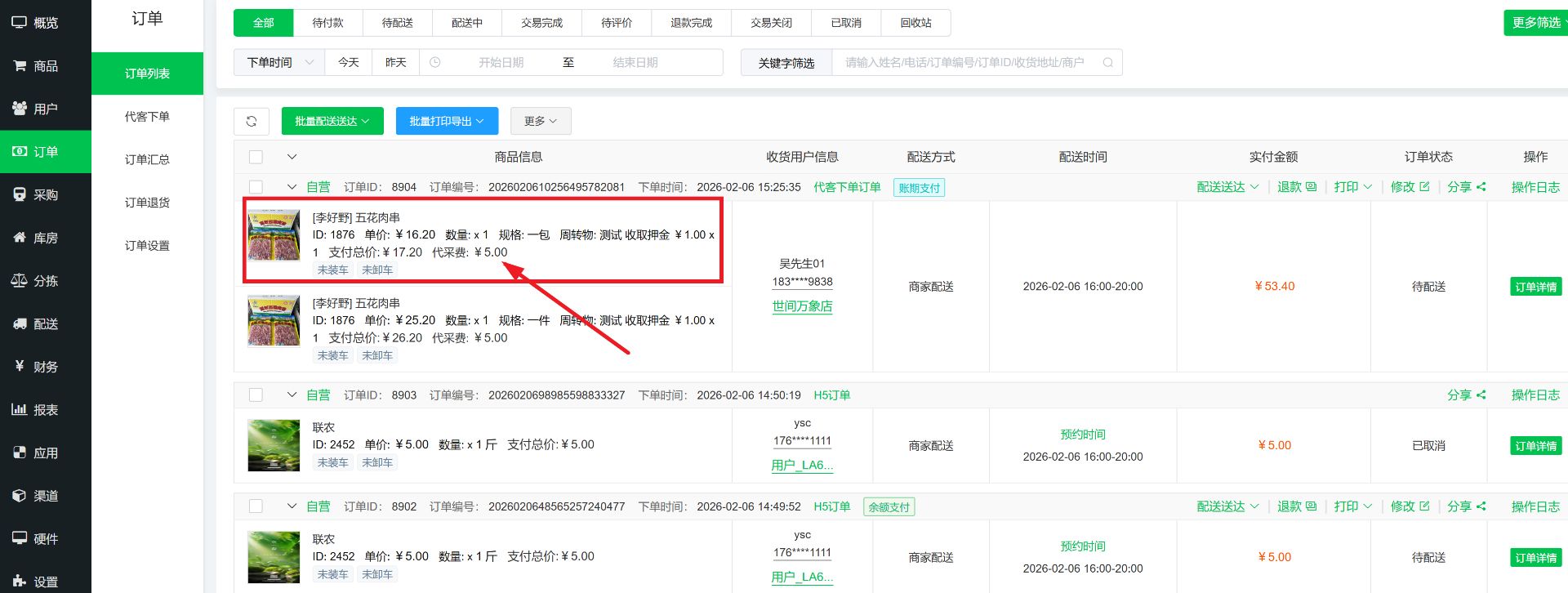 后台订单详情页将明确显示服务费、代采费金额,让订单费用构成更清晰;【解读】:订单完成后,在详情页可直接看到服务费、代采费各自的金额,不用单独核算,方便管理员核对订单成本、客户对账,也便于后续售后查账。