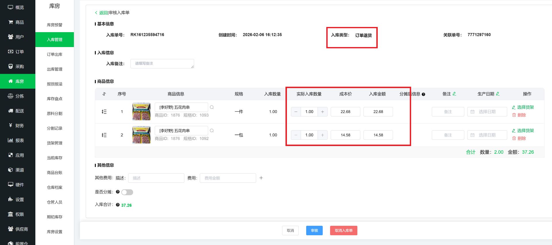 新增商城订单退货入库功能,商城端退货商品后台可直接操作生成退货入库;【解读】:用户在商城端退货后,退货商品可直接录入系统办理入库,不用手动记录,实现"退货-入库"闭环管理,避免退货商品丢失、积压,方便仓库管理。