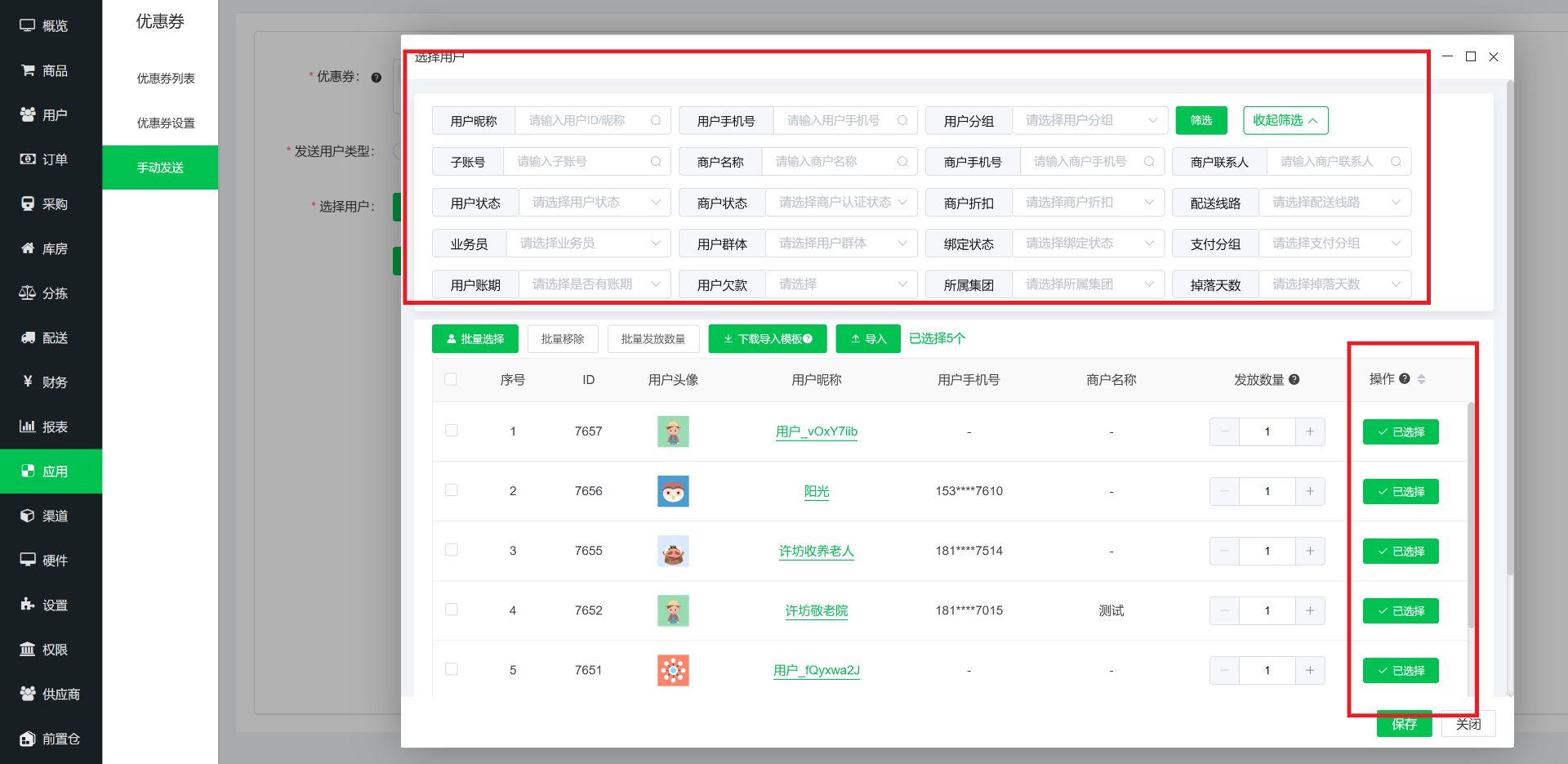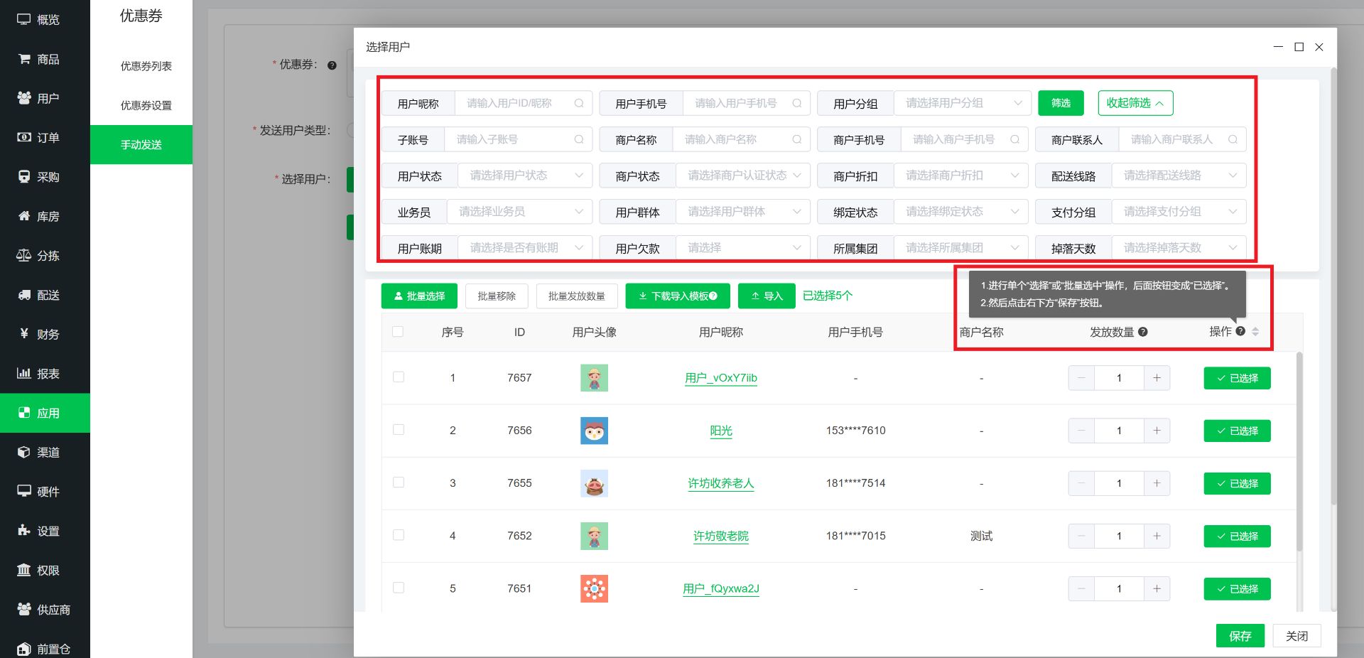 优惠券手动发放选择用户时,增加筛选条件搜索功能,可快速找到目标用户;【解读】:管理员手动发放优惠券时,可通过手机号、客户名称等筛选条件,快速找到需要发放的目标用户,不用在大量用户中逐个查找,提升优惠券发放效率。