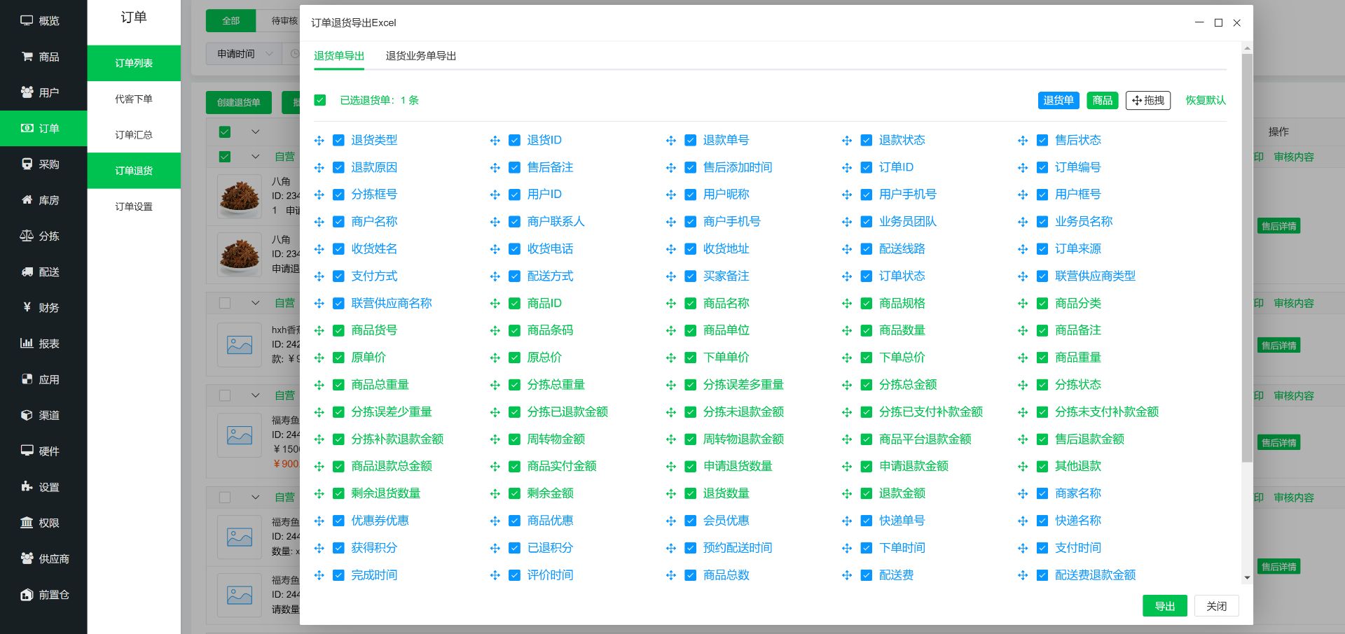 订单退货时,支持导出退货单excel和退货业务单excel,表格支持自定义排列保存样式在浏览器缓存中,同时新增恢复默认设置功能,便于数据导出和格式重置;【解读】:退货后,可将退货单、退货业务单导出到Excel,方便统计退货数据、留存凭证;若导出格式被修改导致异常,一键恢复默认设置,不用重新调试,节省时间。