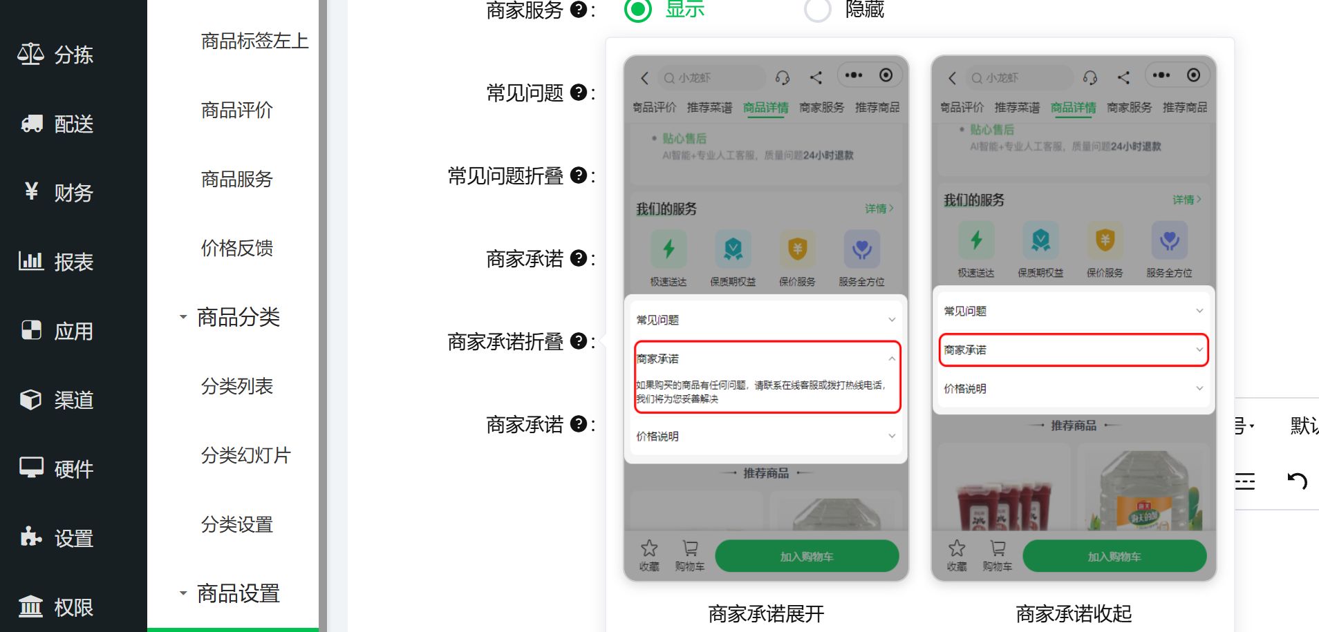 新增商家承诺是否折叠和展开显示开关,可控制商家承诺区域默认展开或折叠;【解读】:商家承诺内容较多时,设置默认折叠,平衡页面空间利用与服务展示;用户想了解详细承诺时,一键展开即可,操作便捷。