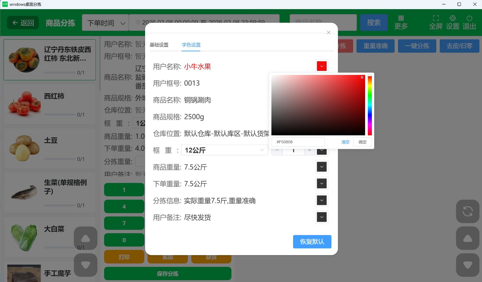 windows分拣端增加商品字体颜色自定义设置功能,可调整商品相关文字的显示颜色;【解读】:分拣人员可以根据windows分拣端的操作界面,修改商品相关文字的颜色,提升文字辨识度,适配分拣人员的操作习惯,减少视觉疲劳,提升分拣效率。