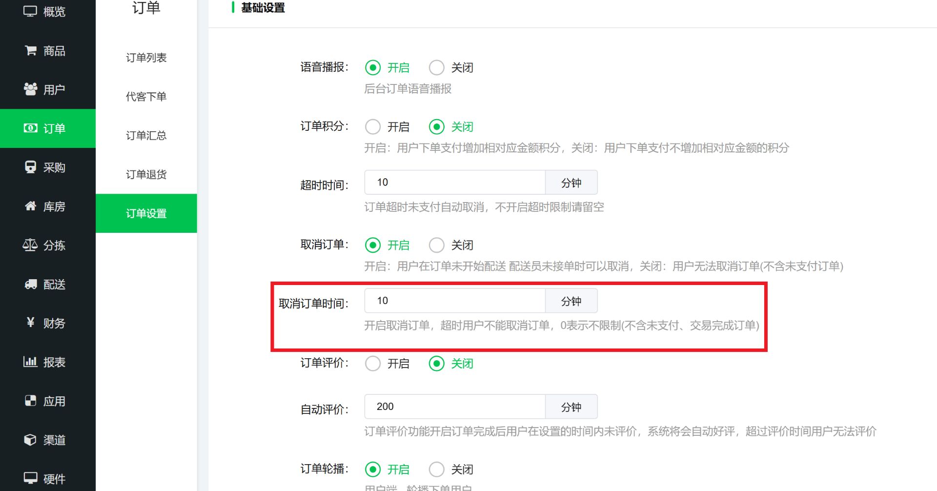 新增订单取消时间设置,可自定义订单提交后多少分钟内允许取消;【解读】:生鲜商品时效性强、易损耗,分拣时效比较快,可设置合理的取消时限(如10分钟),避免用户下单后长时间取消(如商品已分拣完成或者已经开始装车),禁止让客户取消订单,只能走售后流程处理。