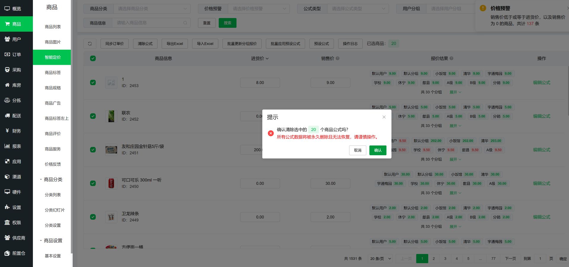 优化后台商品智能定价功能,优化清除商品公式逻辑,避免误操作导致商品价格被清空;【解读】:管理员清除商品智能定价公式时,系统会增加确认提示,且不会自动清空商品已设置的价格,防止因误操作(如不小心点击清除)导致商品定价丢失,保障商品定价安全。