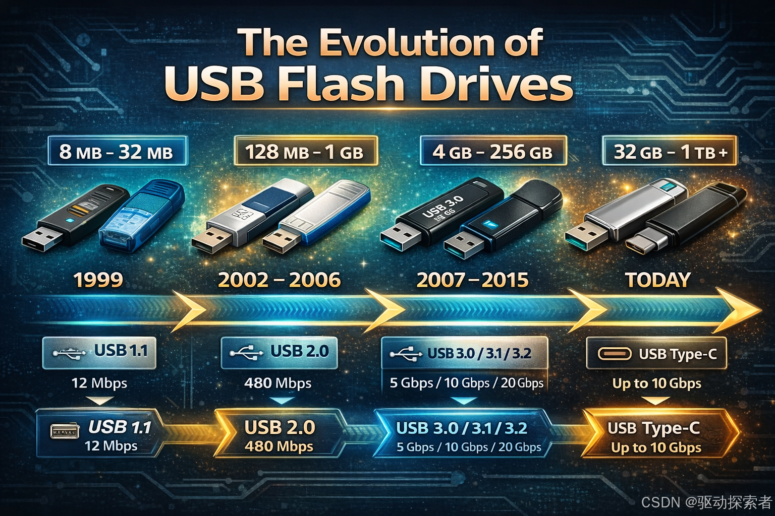 随着闪存技术和USB接口的发展,U盘经历了几个关键阶段: