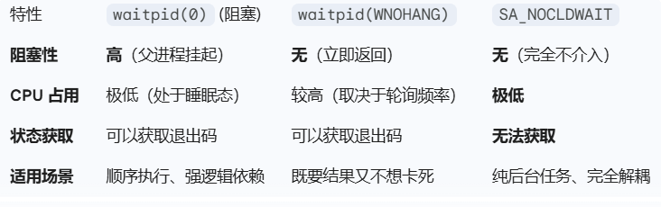 为了完成第二步,我们有三种进阶方案:阻塞回收、非阻塞轮询 (WNOHANG) 和 自动化回收 (SA_NOCLDWAIT)。