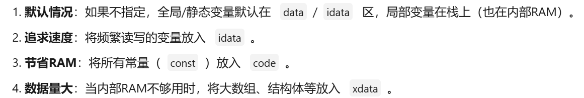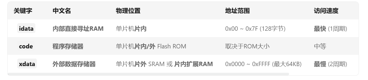 | xdata | 片外大容量RAM/片内扩展RAM | unsigned int xdata big_array[] |