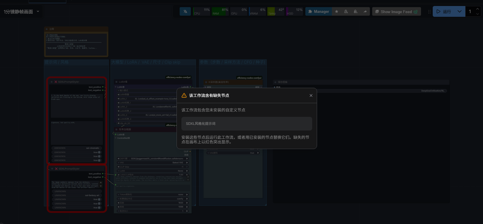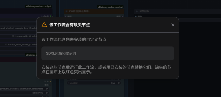 - 首先,这个弹窗 ,明确的 展示了报错原因:是因为有些节点我们并没有安装 (下方第一句英文直译:加载图形时,未找到以下节点类型)。并在末尾提示了:没有安装的节点,会用红色展示: