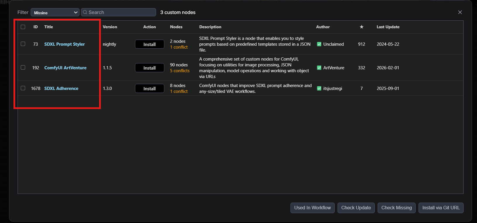 - 在弹出的新窗口中会看到刚才缺失的四个节点 ,下边三个没有安装,直接点击 "Install" 安装即可: