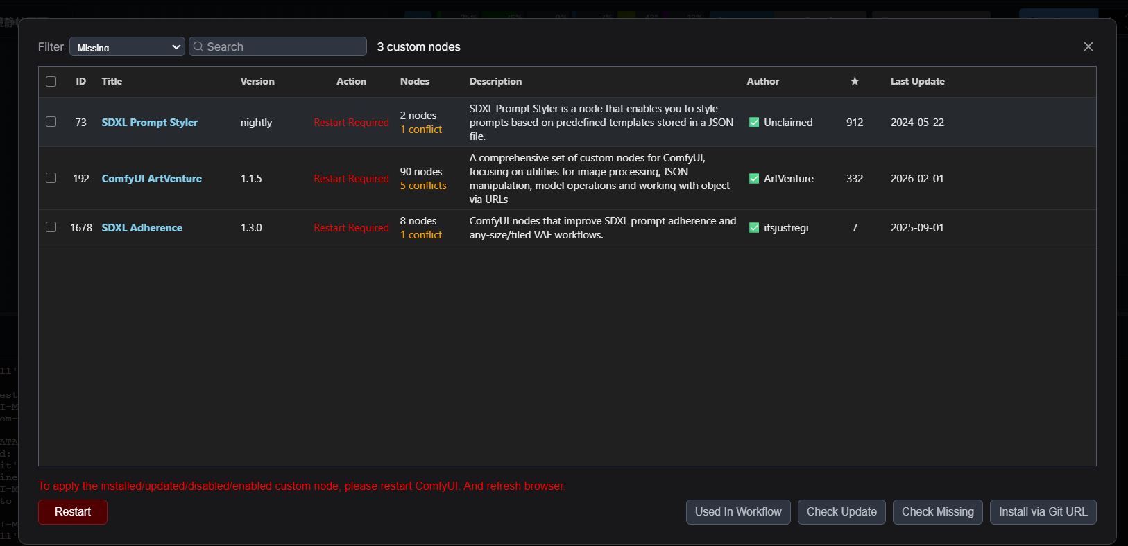 - 下边有一行小字提示 "To apply the installed/updated/disabled/enabled custom node, please restart ComfyUI. And refresh browser." 翻译过来就是 "需要重启 ComfyUI 才会生效"。