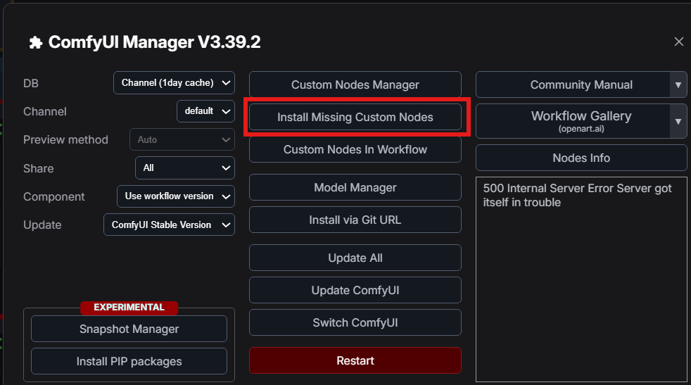 - 然后点击左下角的 "Restart" 重新启动 ComfyUI。