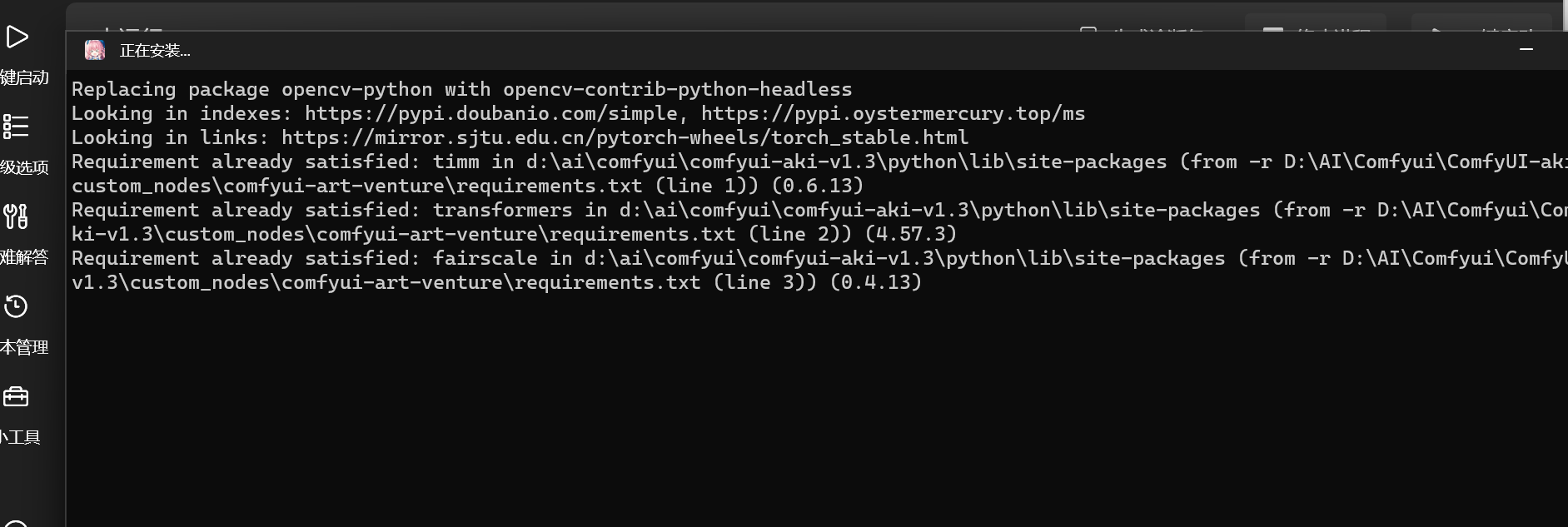 - 这个时候会弹一个新的窗口 ,根据提示,你会发现,它正在国内镜像网站上下载插件安装包 (这也是秋叶 ComfyUI 启动器的优点 ,直接配置好了各种插件的国内镜像 ,使用过程中可以不需要魔法 。当然,有时候有些插件 安装起来没这么顺利,还是需要魔法,到时候我们遇到再讲。)
