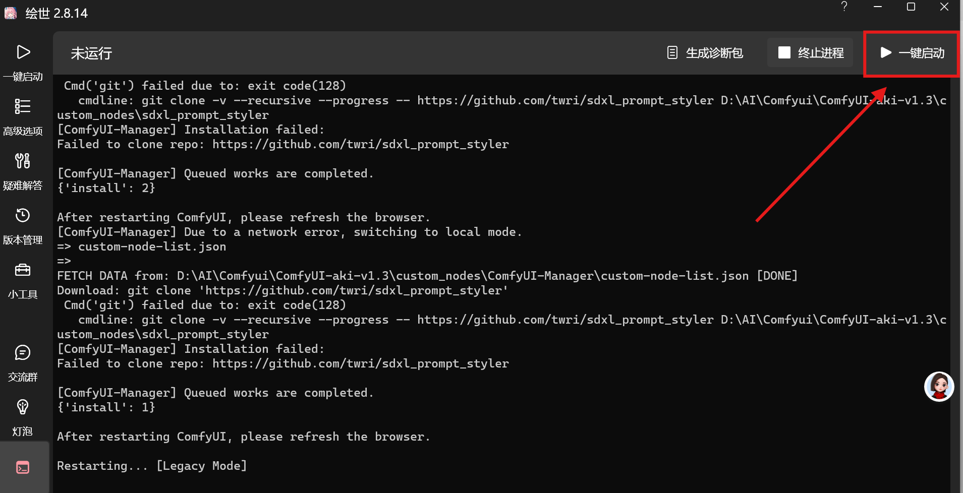 - 这个时候,我们就需要回到后台 (也就是秋叶启动器)中,看到程序已经正常退出 ,但是没有重新启动 ,所以我们需要点击一下右上角的 "一键启动" 来手动重启一下服务。