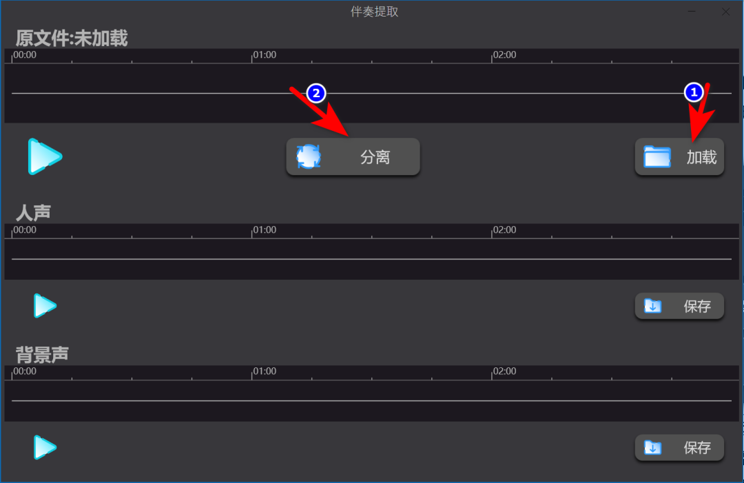 操作特简单:打开软件先【加载】你要处理的歌,加载完点【分离】,等进度条走完,人声和伴奏就分好了,再分别点保存,想存哪存哪,一步到位。