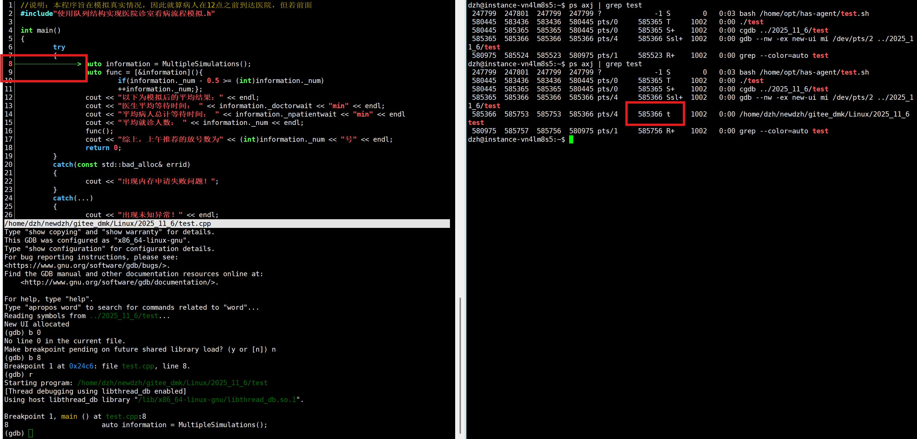 t表示的是Linux的一种跟踪/等待状态,最常见的出现场景如cgdb/gdb打断点调试程序时,遇到断点,被调试的程序就会进入该状态,示例为:这里需要注意,使用cgdb时,若还未使用r启动被调试程序,则被调试程序的进程其实是没启动的,当r到断点,被调试程序就会处于t状态