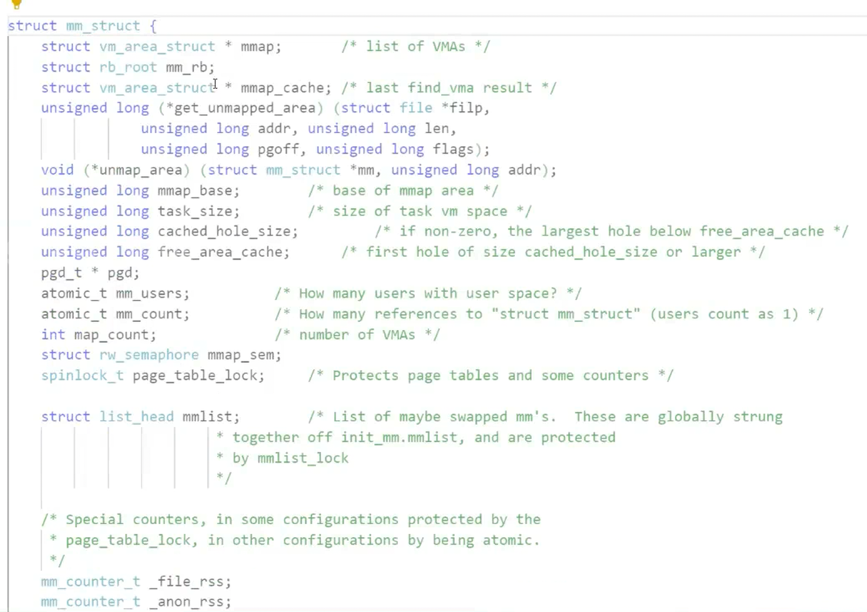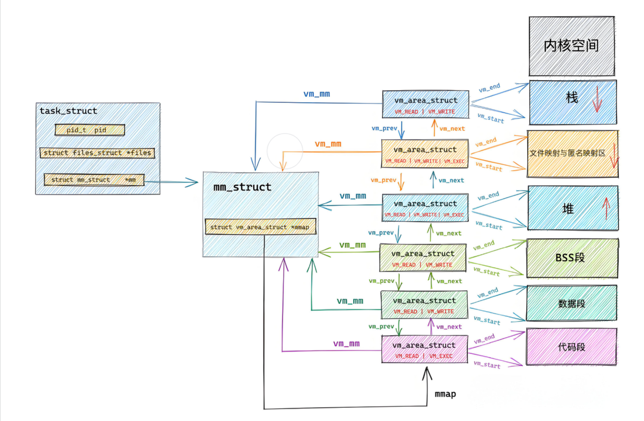 通过图示可以观察到,mm其实也被task_struct(即PCB)管理,而mm(内存描述符)结构体中具备mmap指针连接一个由VMA结构体组成的链表,VMA结构体中存储着虚拟地址空间中各个区域的信息(其中存储的信息比mm中的更细),实际上,VMA才是直接管理各个区域的结构体,值得一提的是,由于堆区空间使用的不确定性(由用户手动申请和释放)以及堆区空间相对较大,极容易导致大量内存碎片,所以,可能会使用多个VMA结构体将堆区空间分成多份进行单独管理(特别是一次性申请很大空间如1GB时,很可能会直接创建一个新的VMA),像是栈区,由于直接由内核进行管理,申请和释放的时机都可预期,所以不会出现内存碎片,并且栈的空间相对较小,所以平时仅使用一个VMA进行管理