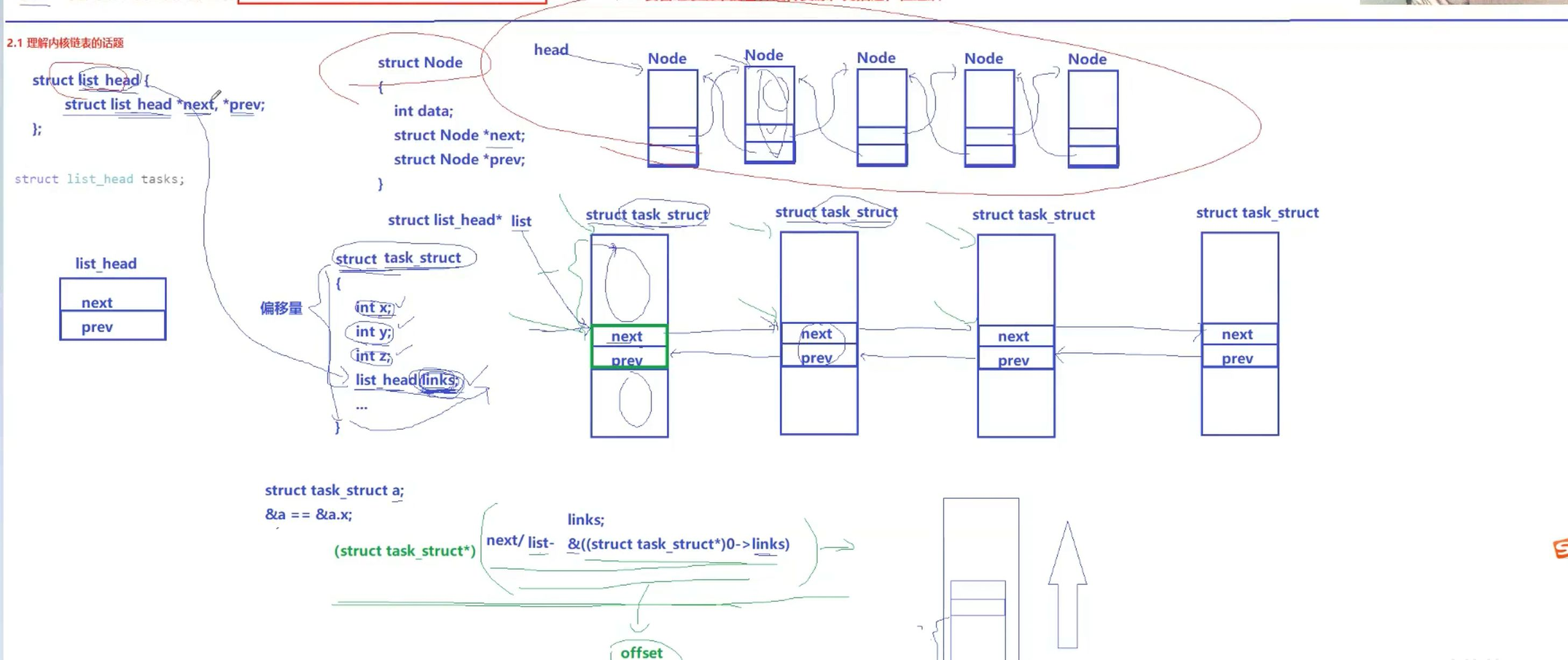 首先,这种特殊链表是可以访问对应的PCB中的数据的,还记得学习C语言时,曾接触过的offsetof宏吗?该宏位于<stddef.h>,作用是计算结构体/联合体中某个元素的偏移量,曾经还曾模拟过该宏的实现,#define My_offsetof(type,ys) &(((type*)0)->ys),思路其实不难,就是将0强转为该结构体的指针类型,然后使用该指针访问结构体中对应的元素,找到该元素的地址(仅仅返回地址,不访问该内存,是不会造成越界访问的),这里的特殊双链表结构也可以利用同样的思路进行PCB结构体中的数据访问
