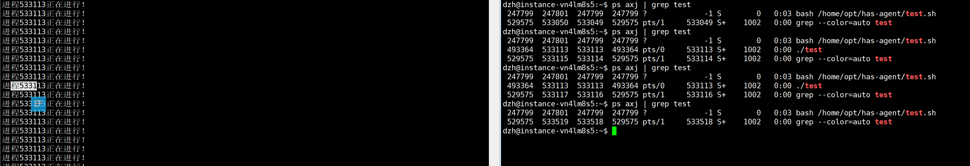 这里注意下,看右边的Xshell界面,T之前的pid是bash的pid,但这里的Ctrl + Z是将cin阻塞的进程设置为了T,T所在行开头的第一个是父进程,也就是ppid,第二个才是pid(即cin阻塞的程序)