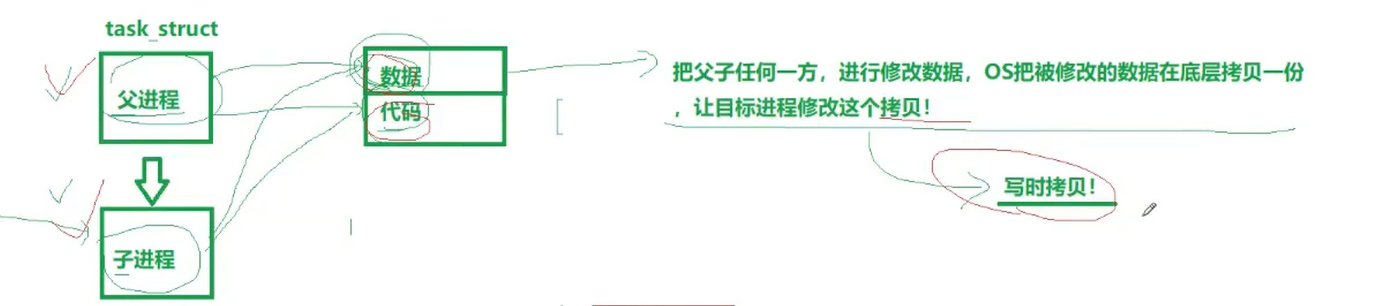 #include <unistd.h>中的fork()函数创建子进程,当创建子进程成功时,该函数可能会返回两次返回值,父进程中返回新创建的子进程的pid,而子进程中返回0,当创建子进程失败时,仅在父进程中返回-1,创建的子进程会copy父进程进程控制块中的大部分数据(少部分如pid不会cv),且不会创建新的程序,也就是说,子进程创建后虽然会创建出新的操作系统管理用节点,但该节点与父节点连接了同一块代码和数据,需要注意的是,为了保证进程之间的独立性,当某个进程出现更改数据中某个值的操作时,操作系统会为其创建一份新的该值(即不更改时共同使用,更改时再创建一份源数据中被更改的变量,注意是拷贝那几个被更改的变量,而非直接拷贝整份数据,此行为被称为写时拷贝,在学习python基础面对不可变类型时了解过类似行为)