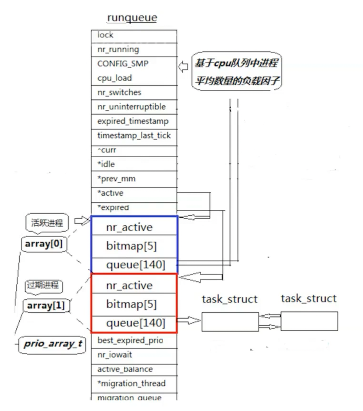 active与expired指针,从上图可以看到就绪队列的结构体中还具备这两个指针,其实,它们就是指向上述两个hash结构的指针,其中,active指针会指向当前正在运行进程的hash结构,而expired指针会指向当前没有正在运行进程的hash结构,当一个hash机构运行完毕后,就会swap(&active, &expired)(这里取地址是C的写法,理由是Linux底层是用C写的,若为C++的话,参数设置为引用即可) -