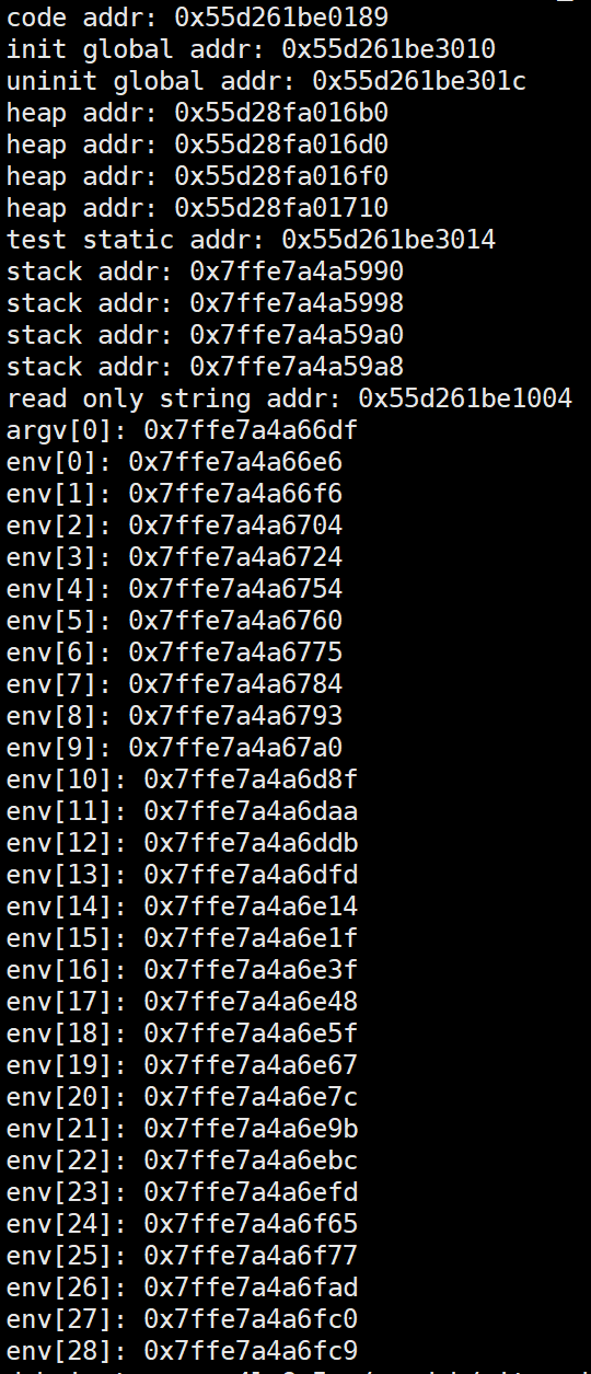 这些区域从低地址处到高地址处的顺序依次为:正文代码区、只读数据段、初始化变量区、未初始化变量区、栈区、共享区、堆区、命令参数和环境变量区 - 除了栈和堆的地址是按照定义顺序递减/增外,其他区域可能仅仅是单纯的映射关系,不一定满足什么线性关系(例如hash的映射般)
