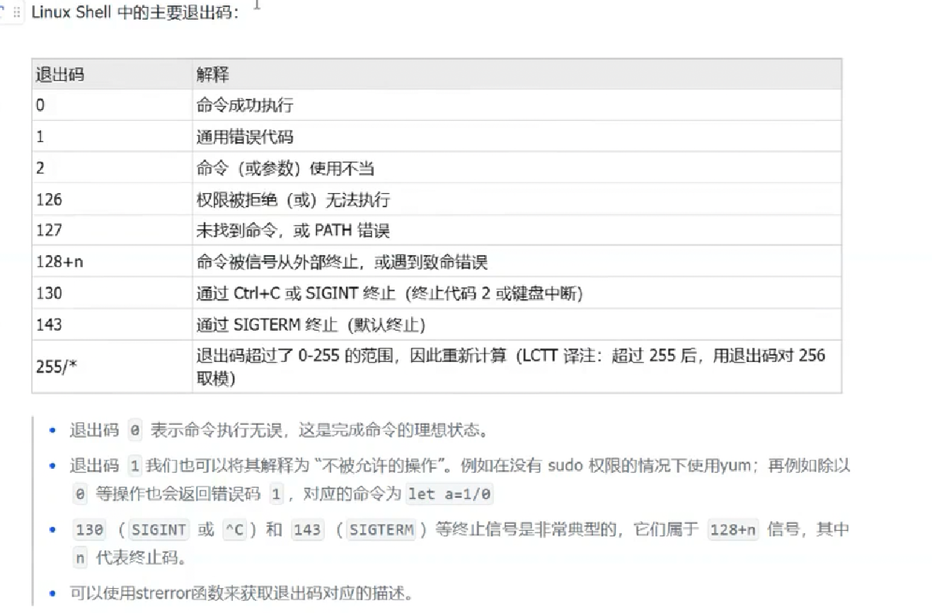 使用return语句以及exit/_exit函数时,都需要一个退出码,该退出码代表的含义有可能存在平台差距,但一般情况下,退出码为0表示程序正常退出,而非0多半是异常退出,可以使用位于string.h头文件的strerror函数将退出码转换为错误信息字符串进行输出,另外值得一提的是,当程序因为运行时异常而退出时,其退出码没有意义,应该关注退出时的发出的信号(在之后的信号章节会进行介绍)