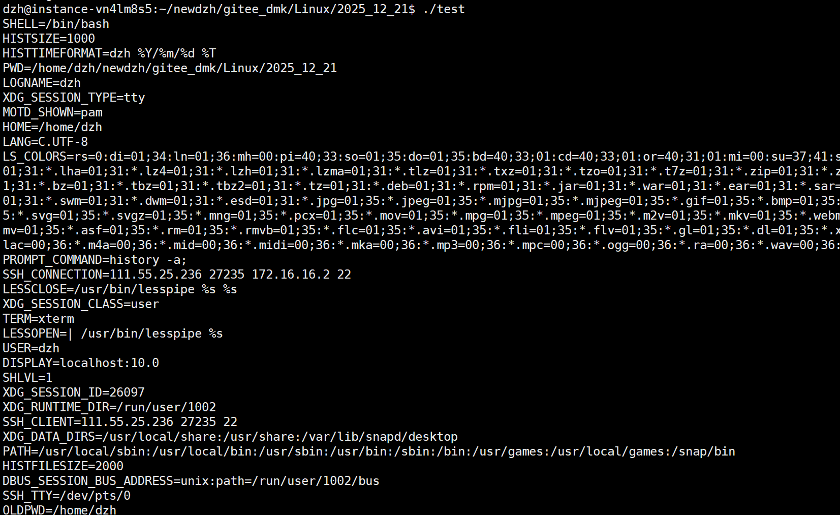 注:为当前进程新增环境变量的函数putenv,其函数原型为int putenv(char *string),参数为:string为环境变量,格式为"变量名=变量值",该函数会向当前进程的页表中添加该环境变量(注意是在原环境变量的基础上进行添加,而非exec*e系列函数一样直接覆盖)