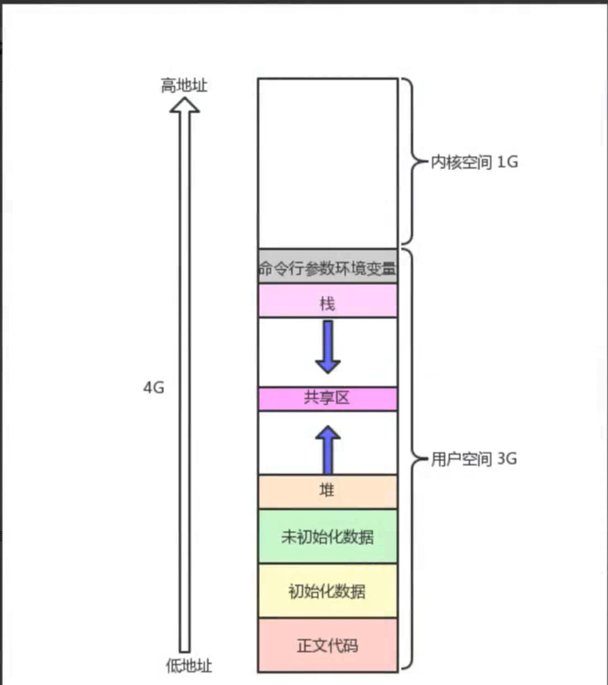 借着这张图,先来多了解一下虚拟地址空间,首先,每个进程都有一个独属于自己的虚拟地址空间,对于32位机器,它的每个进程的虚拟地址空间大小均为2 ^ 32 * 1Byte = 4G(地址范围均为0x00000000~0xFFFFFFFF),而64位机器的每个进程的虚拟地址空间大小为2 ^ 64 * 1Byte = 16EB,为了便于理解,下面都会以更简单的32位为例进行说明