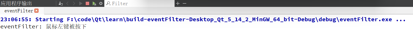 最终我们运行程序触发事件,看看输出的信息是属于哪个函数内部,如果是eventFilter,说明实现了事件过滤的功能,事件不会再进入到event中。