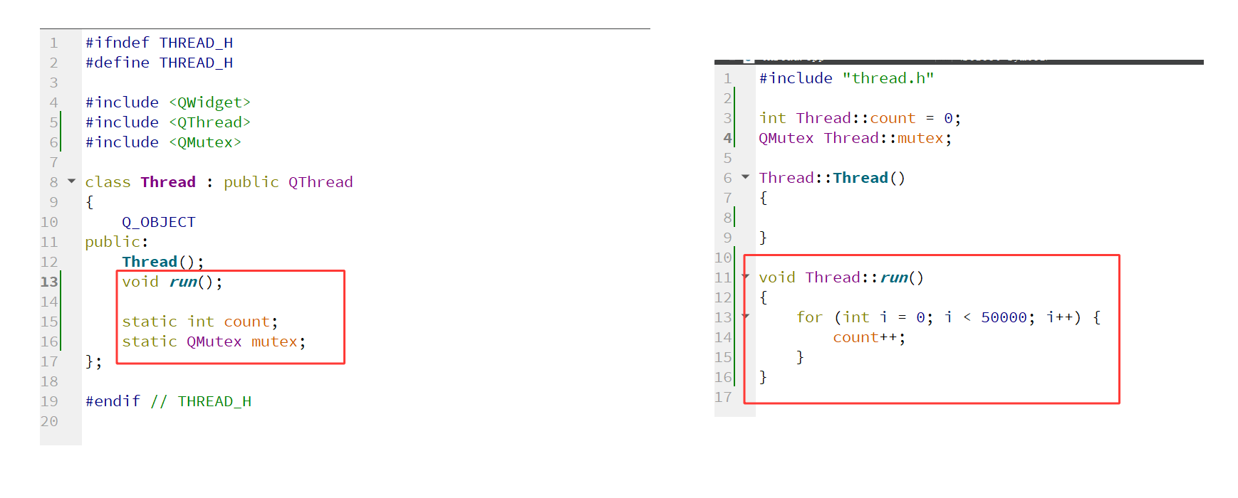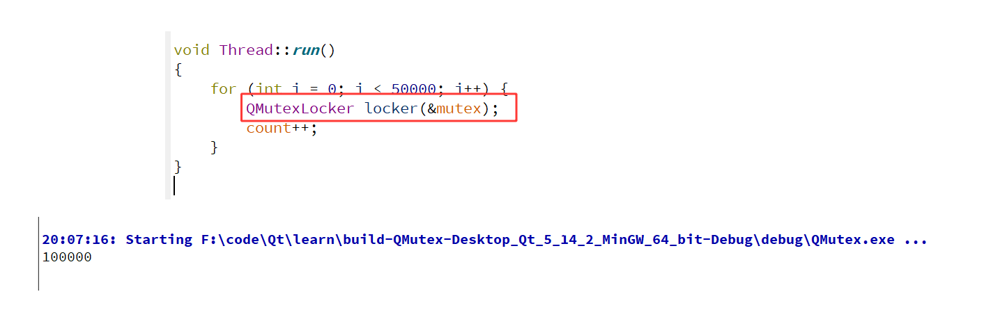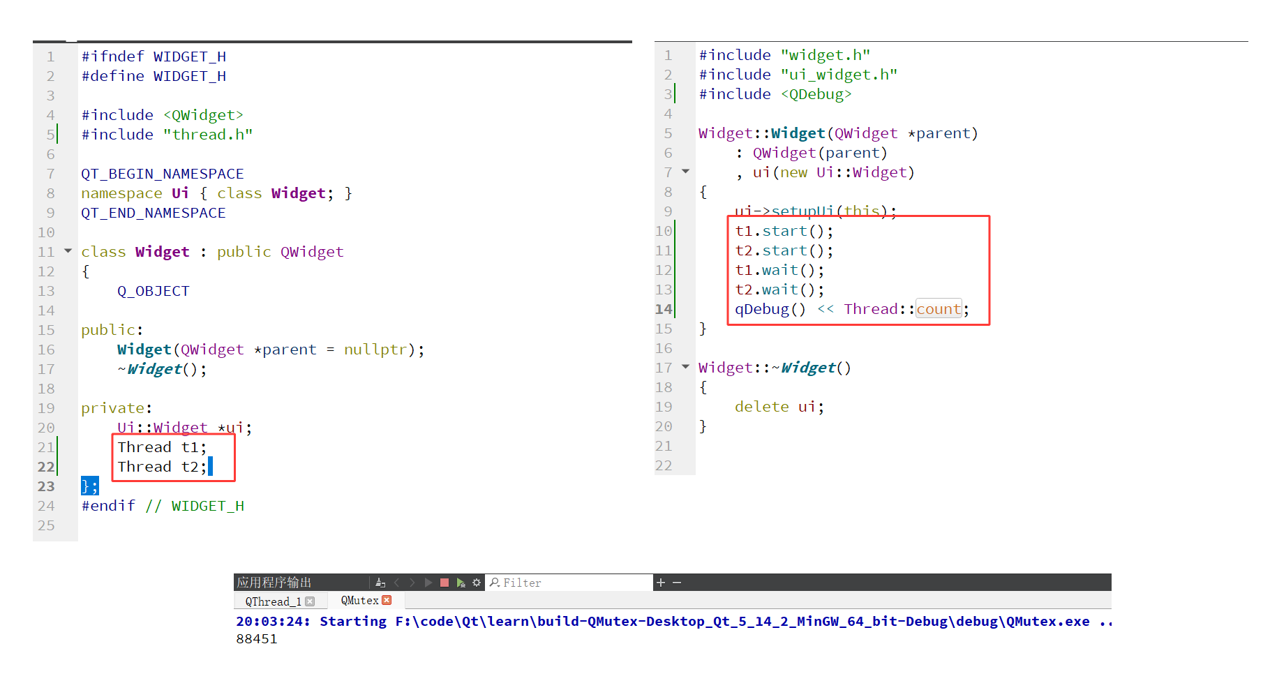 接着在Widget类中声明这两个线程,然后构造函数中启动线程,并通过wait函数阻塞等待线程执行完毕。最后输出结果。我们发现正常结果应该是十万,但是很明显由于没有对count进行保护,所以导致数据不一致。