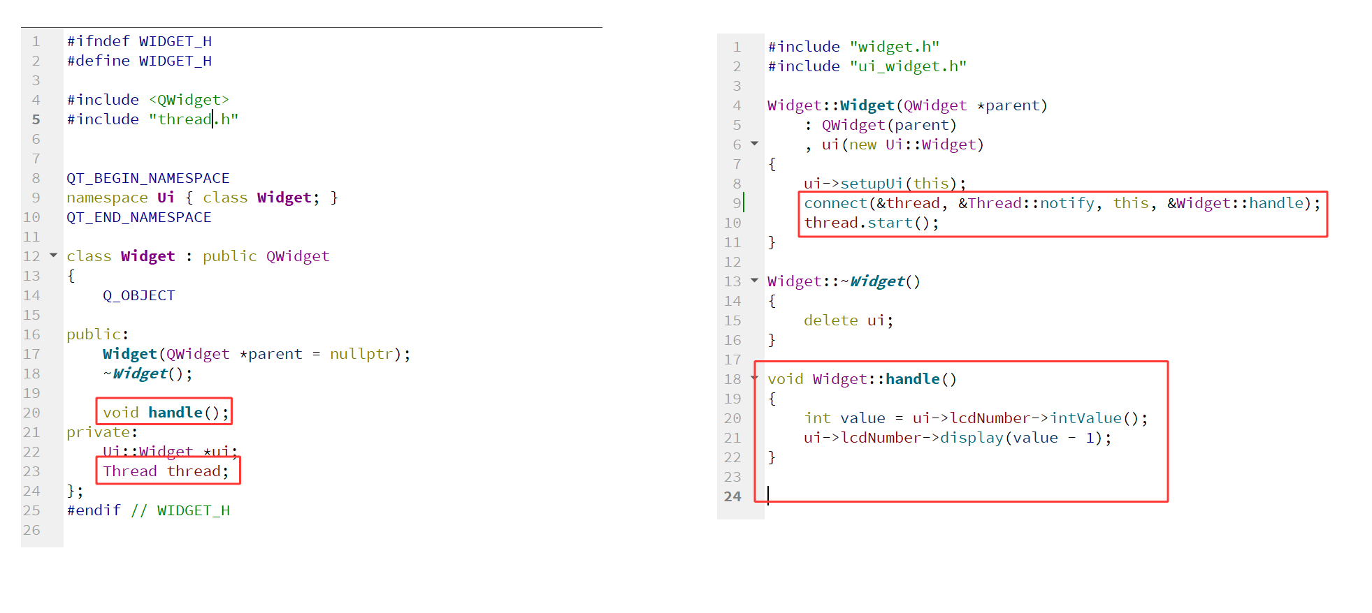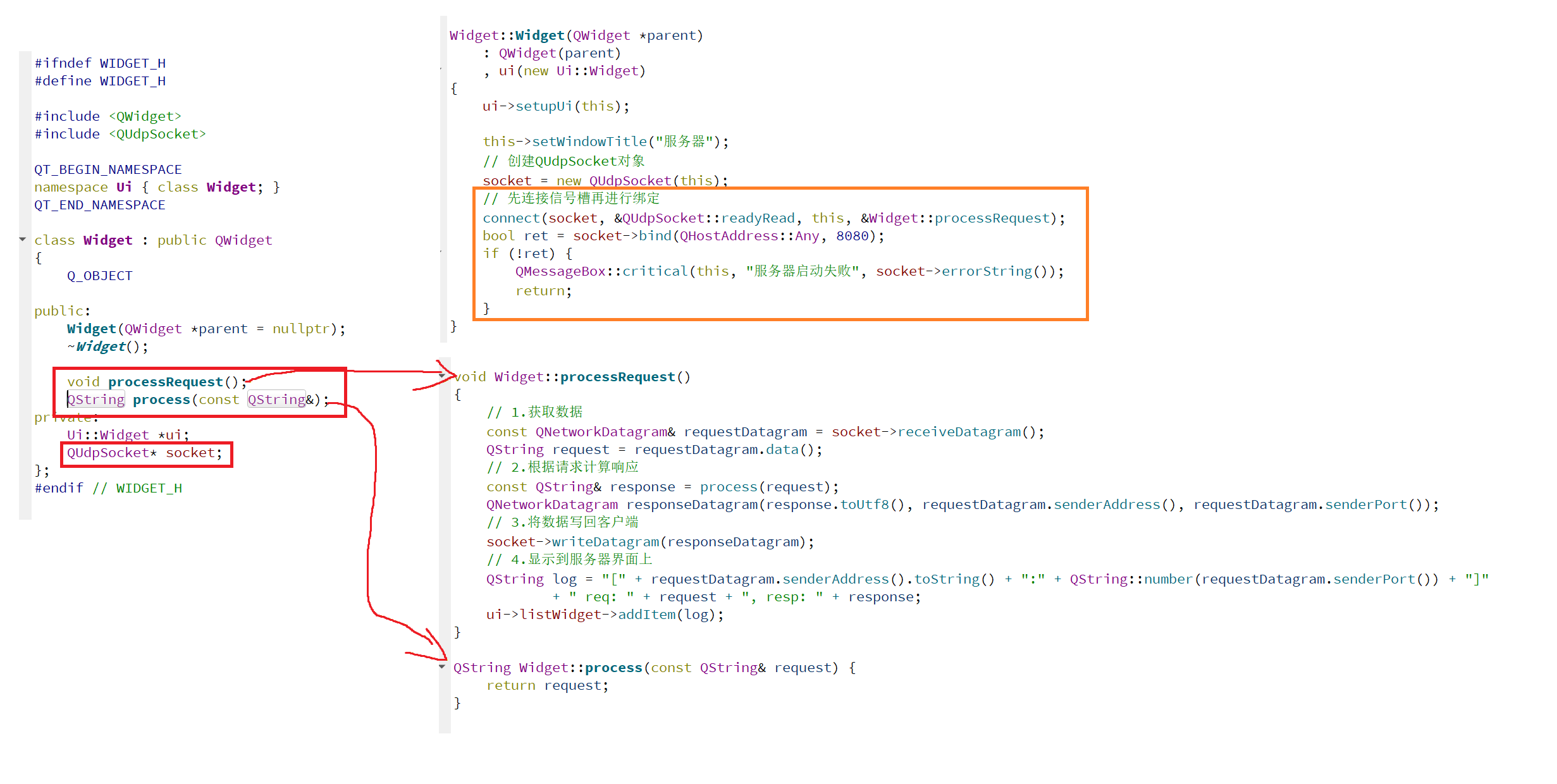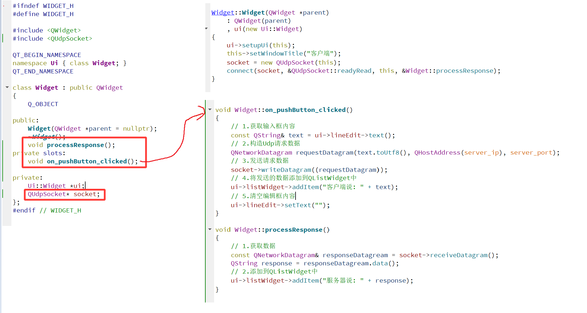 2、在Widget类中声明一个QUdpSocket指针变量,后续在构造函数中实例化。然后提供一个槽函数还有一个处理数据的函数。