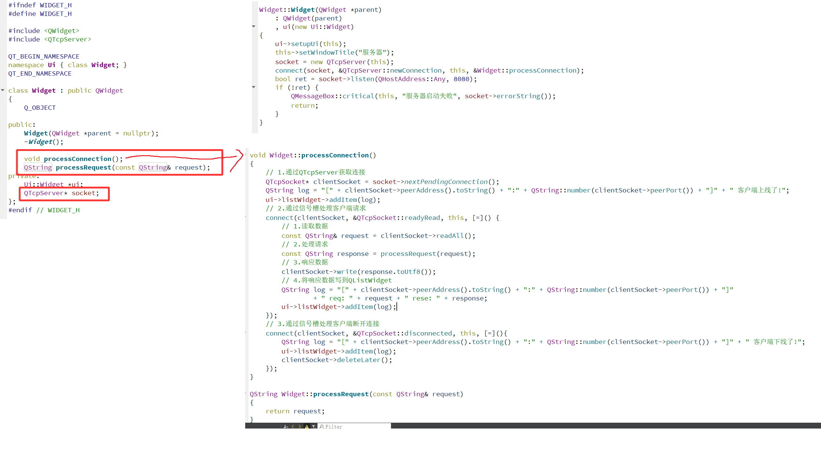 声明一个QTcpServer指针,在构造函数中创建实例,然后先连接信号槽再进行绑定监听,这里和前面UDP是一样的。然后当建立连接后可以获取连接会触发newConnection信号,在槽函数中获取到QTcpSocket,然后设置两个信号槽进行处理即可。这里为了方便我们直接用lambda表达式。