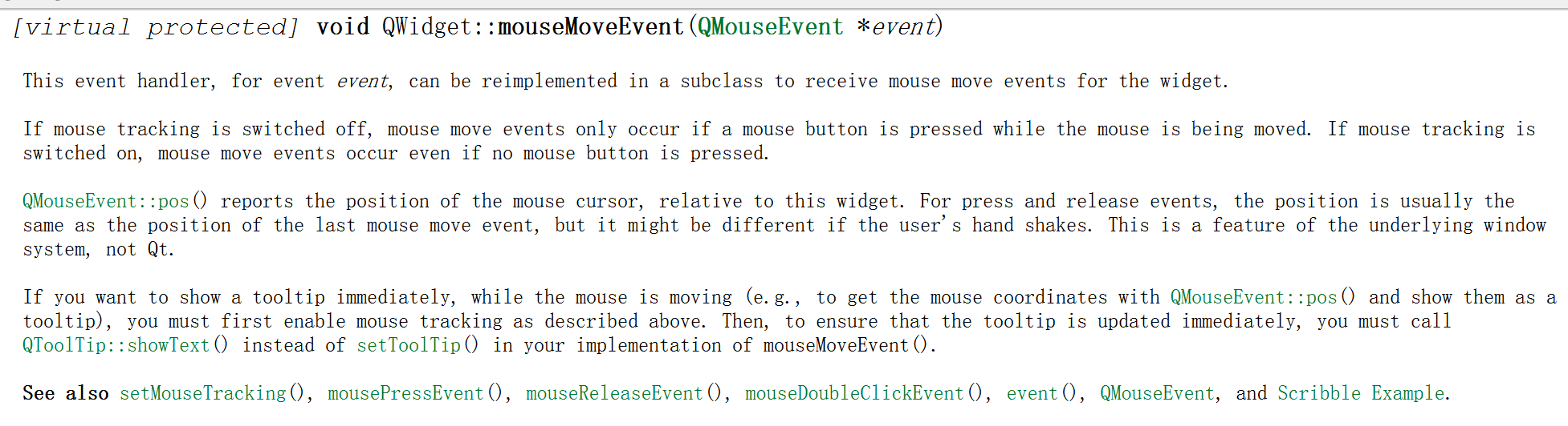 但是直接重写mouseMoveEvent是看不到输出的信息的。这是因为鼠标移动不同于鼠标按下,随便移动一下鼠标会产生大量的鼠标移动事件,当你捕获事件的时候,尤其是在这里进行一些复杂的逻辑,程序负担就会很重,很容易卡顿。Qt为了保证程序的流畅性,默认情况下不会对鼠标移动进行追踪,鼠标移动的时候不会调用mouseMoveEvent。除非显示告诉Qt要追踪鼠标的位置。