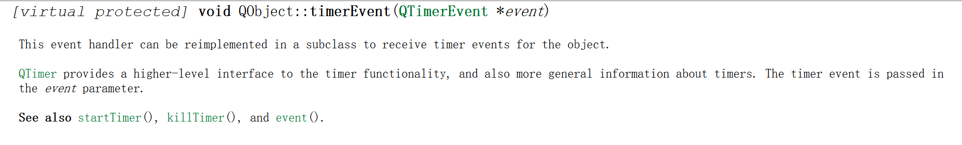 前面介绍过定时器QTimer的用法,QTimer背后是QTimerEvent定时器事件进行支撑的。QObject提供了一个timerEvent函数,需要搭配两个函数来使用:startTimer启动定时器和killTimer关闭定时器。timerEvent函数原型如下: