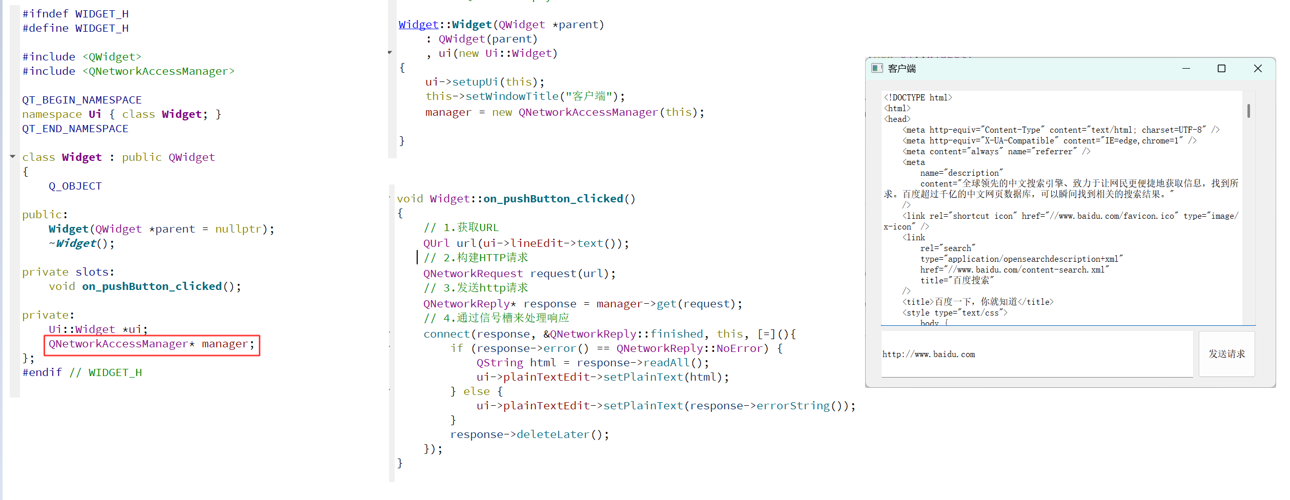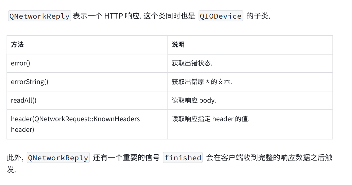 点击按钮后就是获取URL,然后通过URL构造HTTP请求,接着发送请求,然后获取响应并处理,销毁响应数据即可。这里的get方法只是负责发出去请求,并不负责等待响应回来,所以我们需要连接QNetworkReply里面的finished信号。