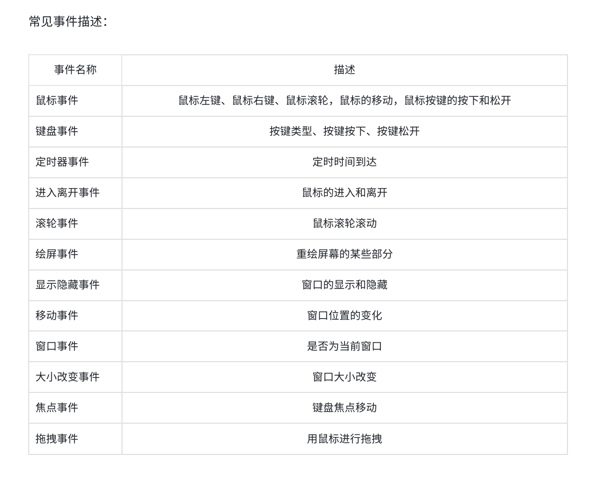 事件是应用程序内部或者外部产生的事情或者动作的统称。在 Qt 中使用一个对象来表示一个事件。所有的Qt事件均继承于抽象类QEvent。事件是由系统或者Qt平台本身在不同的时刻发出的。当用户按下鼠标、敲下键盘,或者是窗口需要重新绘制的时候,都会发出一个相应的事件。一些事件是在用户操作时发出,如键盘事件、鼠标事件等,另一些事件则是由系统本身自动发出,如定时器事件。常见的Qt事件如下: