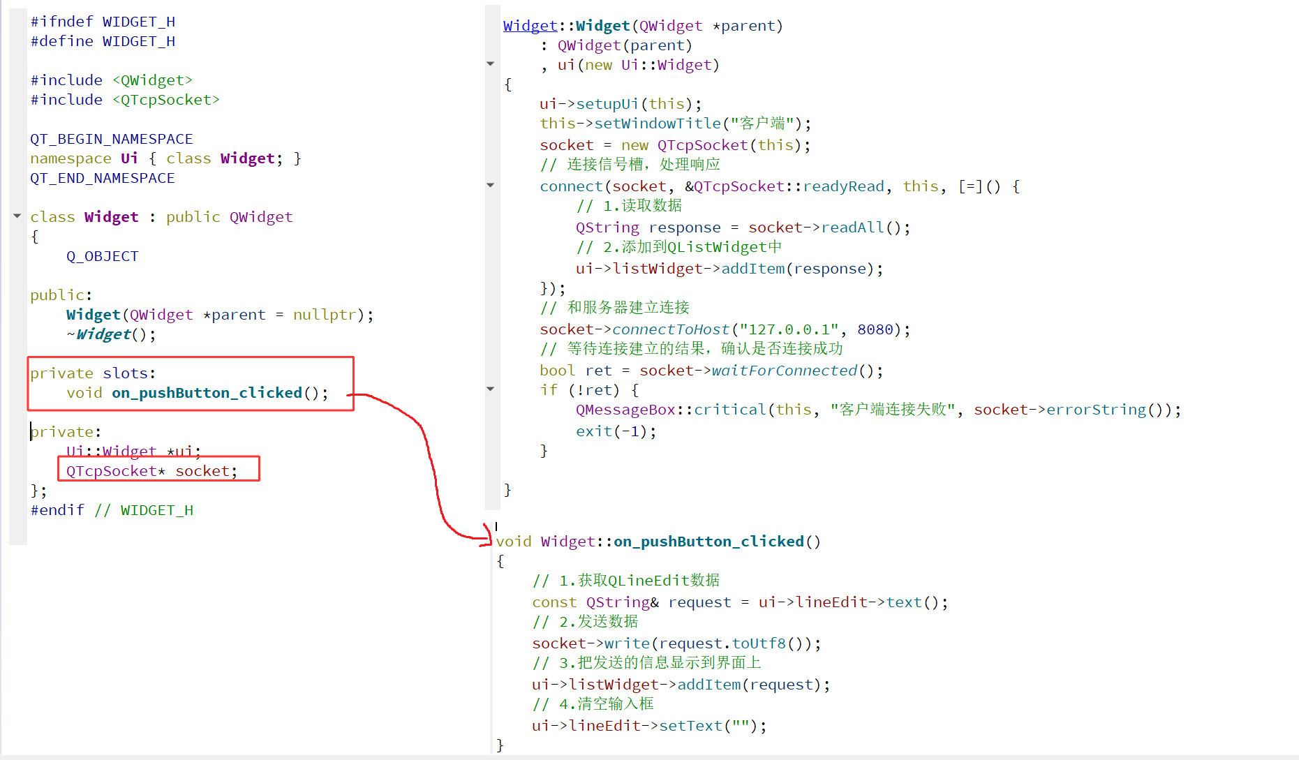 5、在客户端的Widget类也是添加一个指针变量、槽函数、处理函数。在构造函数中创建QUdpSocket对象并连接信号槽。当用户点击时发送数据并添加到QListWidget中,当收到数据就转换成QString添加到QList中。
