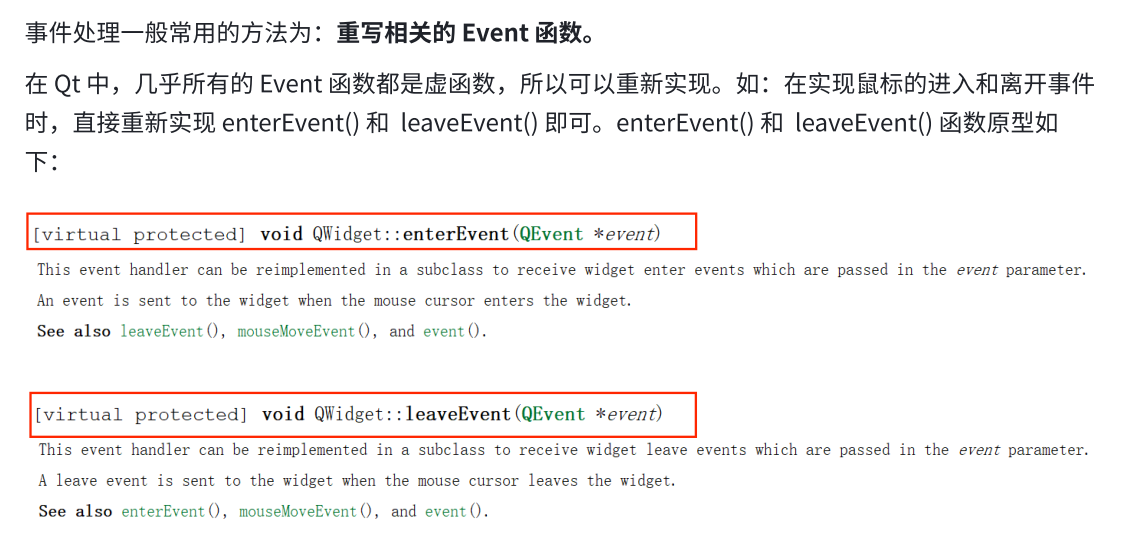 让一段代码和某个事件关联起来,当事件触发的时候就会执行这段代码。之前信号槽是直接通过connect来完成关联的。但是对于事件不太一样,事件这里需要让当前的类重写某个事件处理函数。这样就实现了多态,后续事件触发就会执行到当前类重写的虚函数。