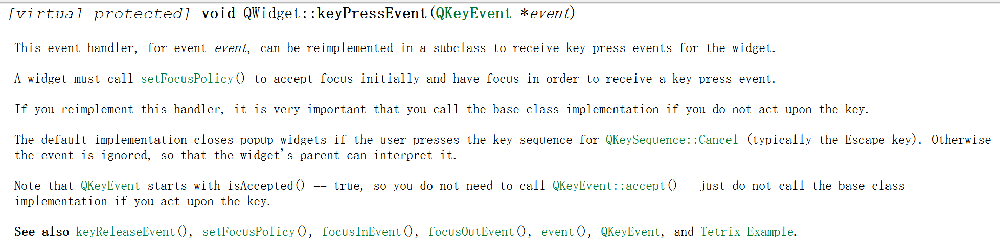 想要获取到用户的按键,可以通过QShortcut来实现,这是信号槽对事件封装过的获取键盘按键的方式。站在更底层的角度,也可以通过事件机制来获取用户按键,通过重写keyPressEvent实现,函数原型如下: