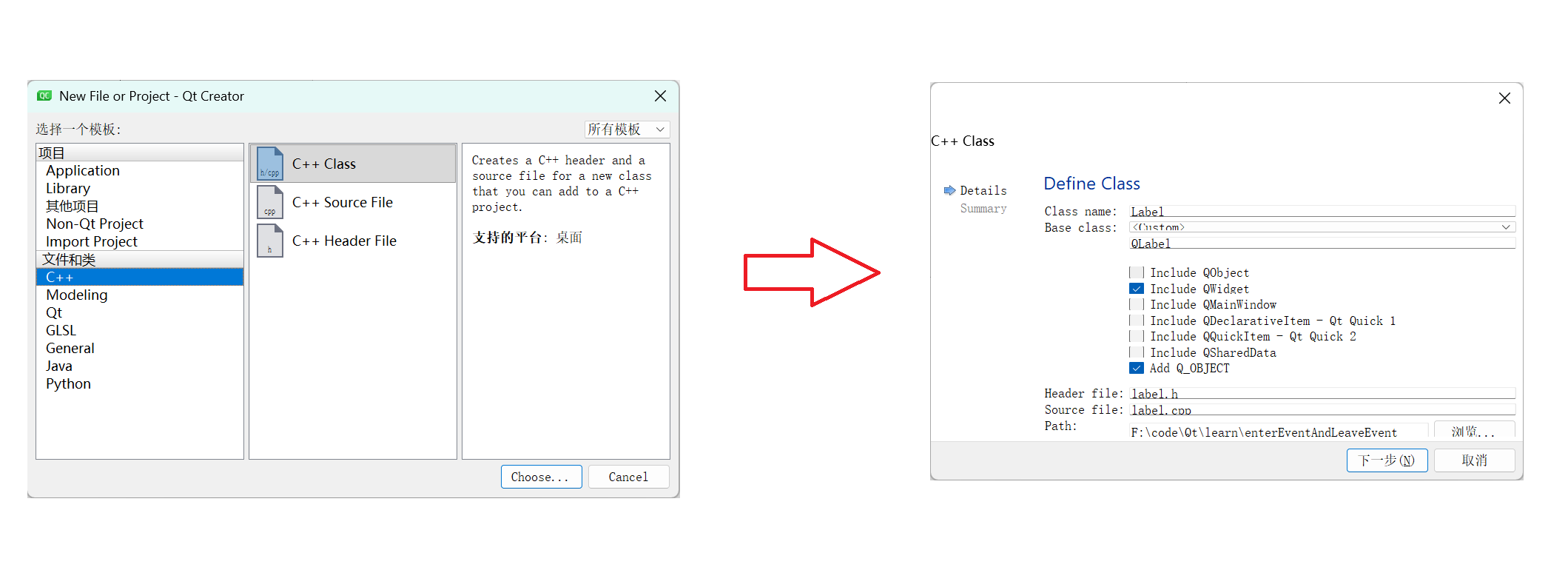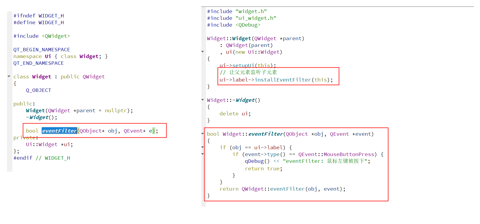下面实现一个样例:创建一个新项目,创建一个QLabel类,然后创建一个Label类继承自QLabel,在Label类中重写mousePressEvent和event,在函数中分别通过qDebug输出信息。接着在父元素Widget中安装事件过滤器并重写eventFilter,判断条件输出信息。