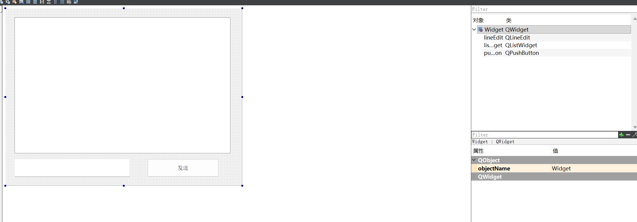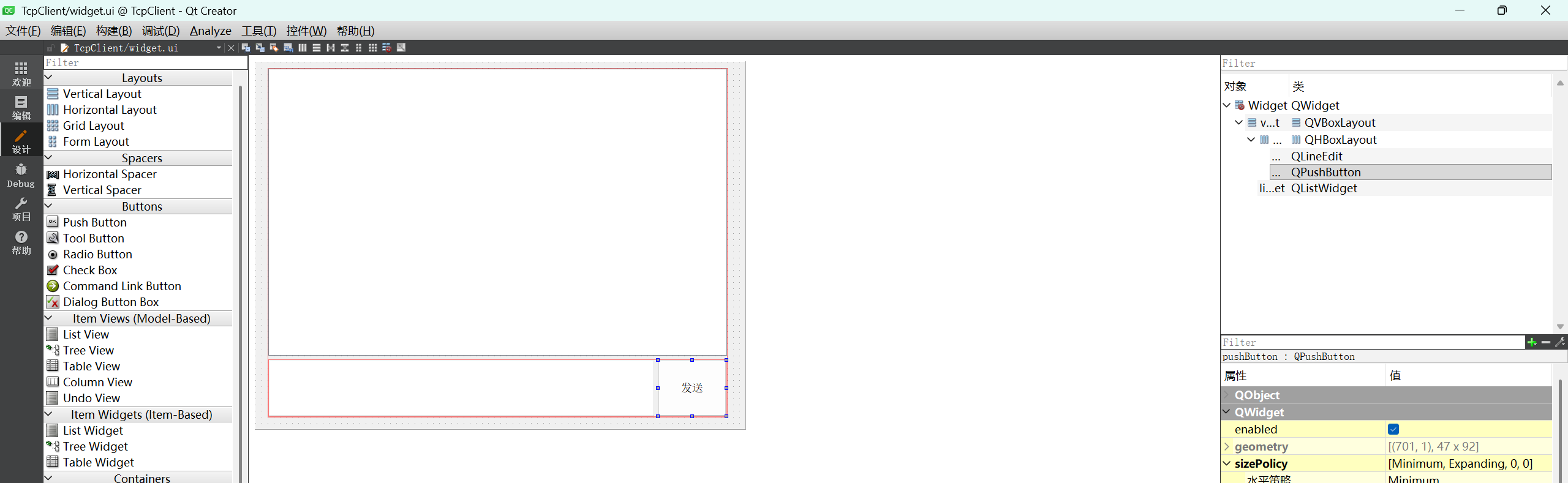 4、先给客户端添加一些控件,如下图所示,这样就可以在QListWidget中添加我们发送的内容和服务器回复的内容。然后在输入框可以输入我们想要发送的内容点击发送按钮进行发送。