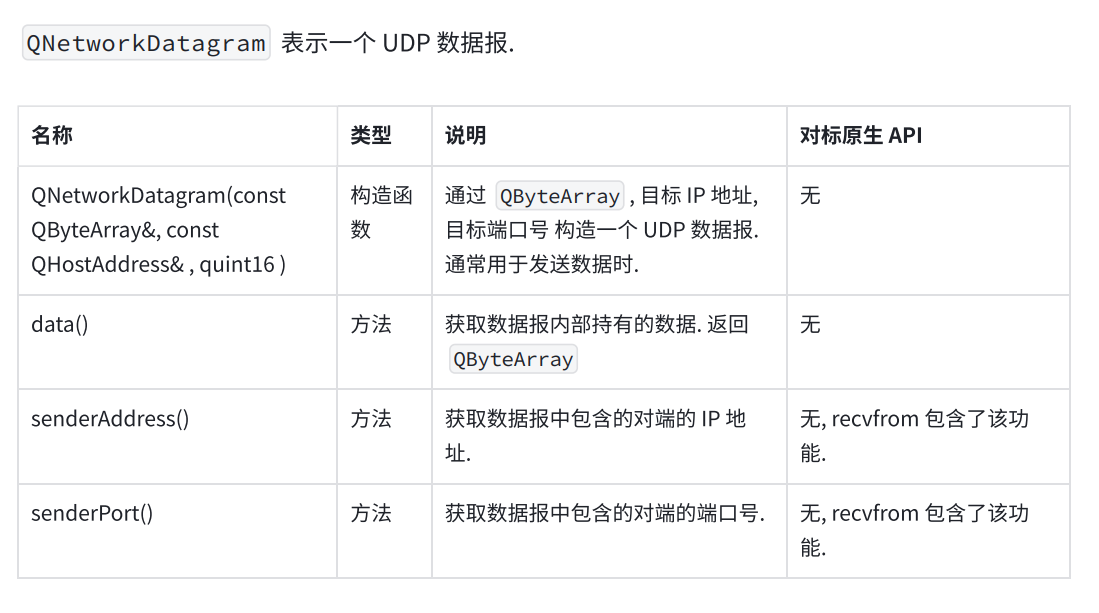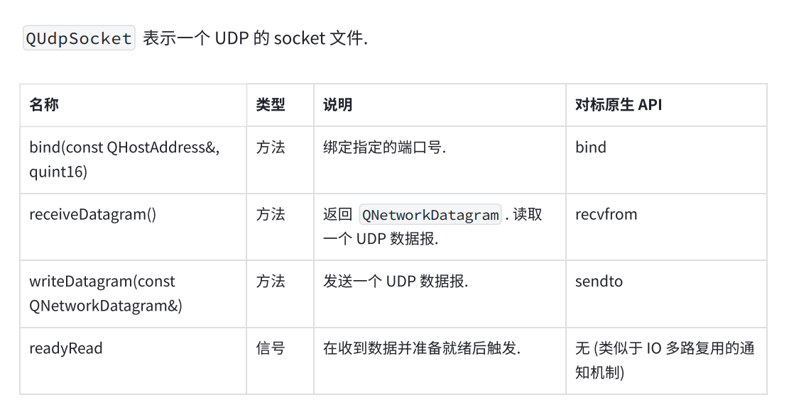 QNetworkDatagram表示udp数据报,当我们读取数据或者写数据都是通过这个参数来实现的。另外我们发现QUdpSocket有一个readyRead信号,我们Linux系统的接口默认读取数据或者写数据是阻塞的,所以如果对方没有发送数据我们就得阻塞住一直等,但是Qt采用信号驱动的方式,当socket接收到数据就会触发readyRead这个信号,此时我们就可以在对应的槽函数中进行处理。