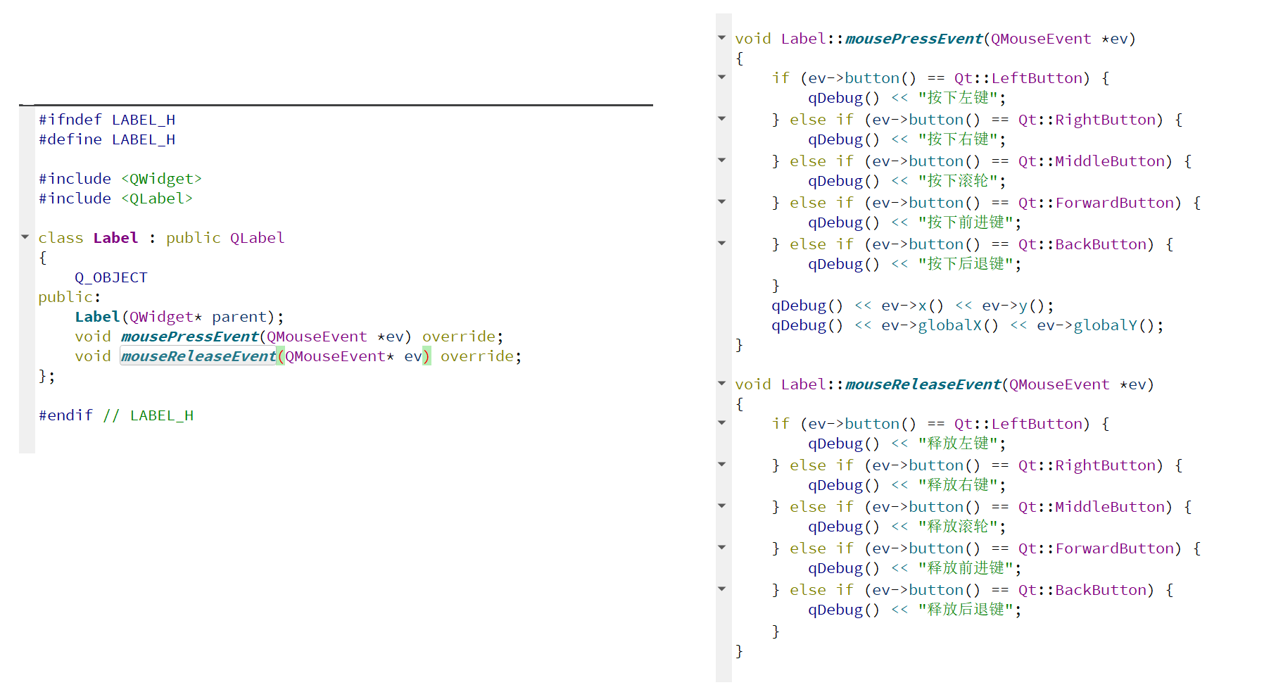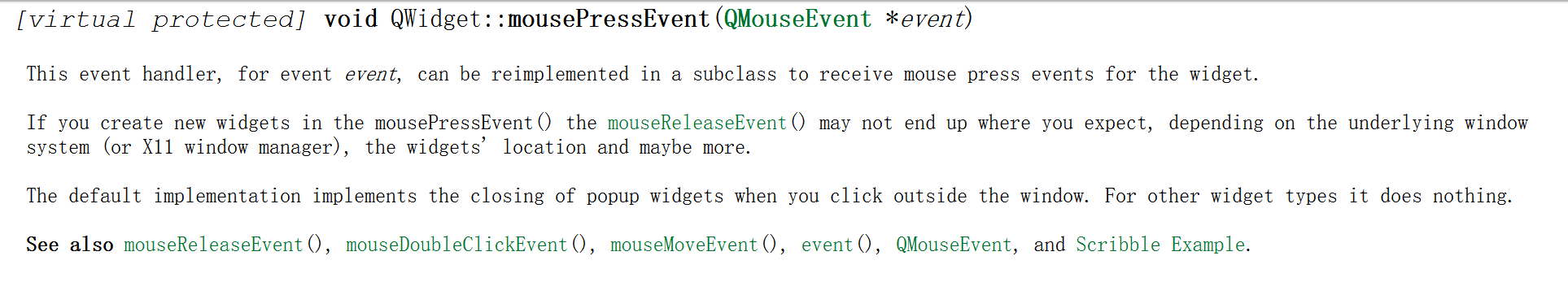 在Qt中,鼠标按下是通过虚函数mousePressEvent()来捕获的。mousePressEvent()函数原型如下: